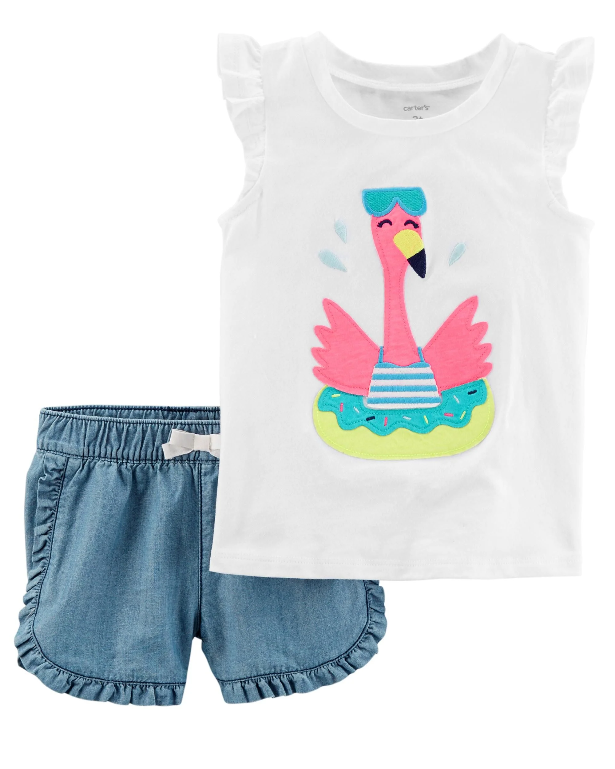Conjunto CARTERS 2-Piece Flamingo Flutter-Sleeve Top & Denim Short Set