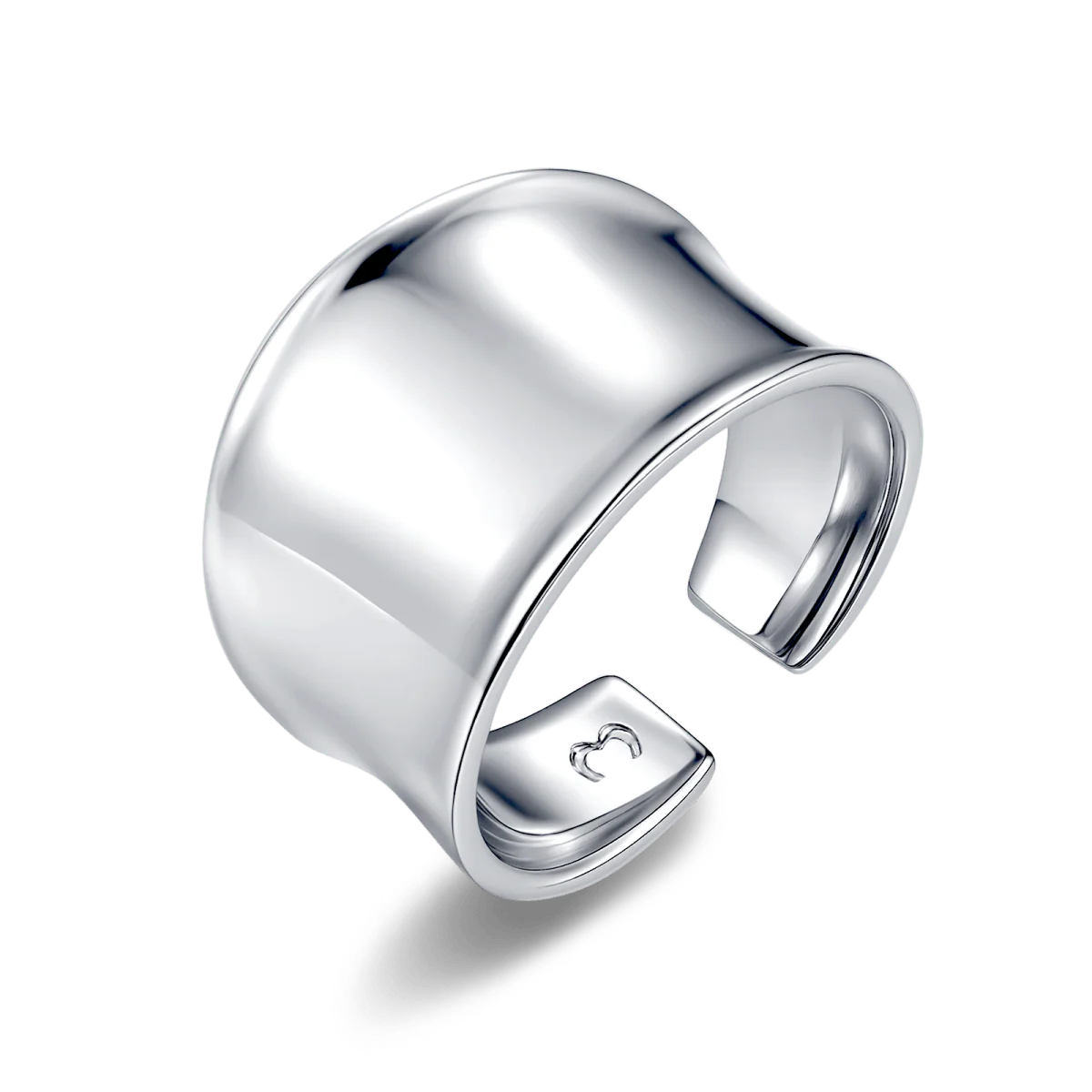 Anillo abierto y ancho de acabado pulido con diseño icónico por su forma asimétrica y sublime, para adaptarse ergonómicamente al dedo, elaborado en plata esterlina.