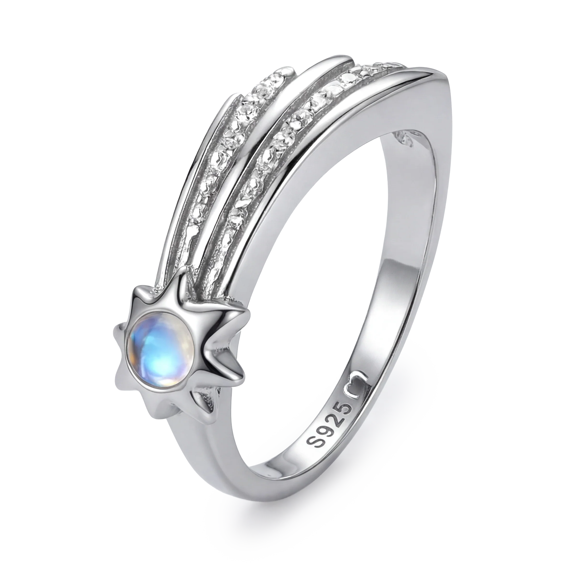 Anillo con diseño distintivo de banda doble texturizada en la parte superior, acompañado de una estrella de ocho puntas y una pequeña esfera de color azul con efecto de brillo iridiscente, elaborado en plata de primera ley (S925).