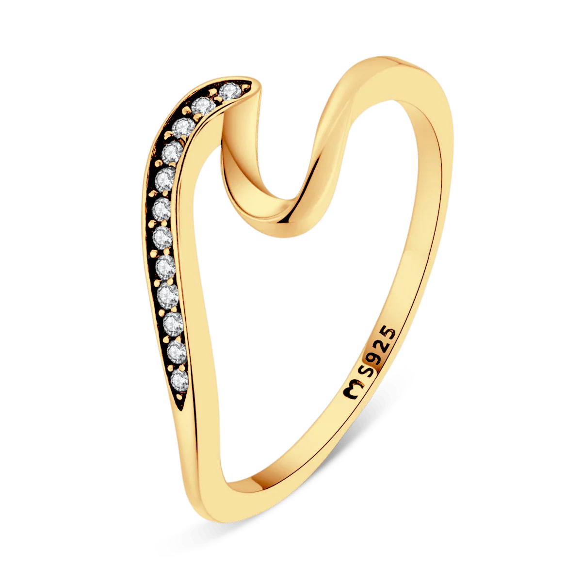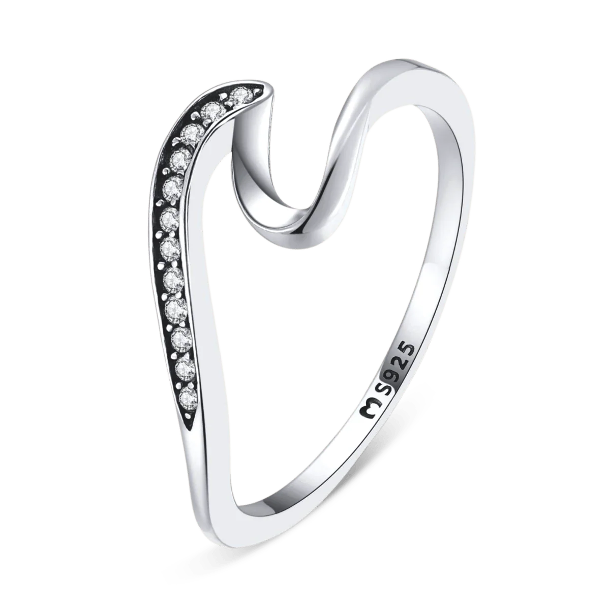 Precioso anillo con una elegante onda acompañada de circonitas brillantes, en plata de primera ley (S925).