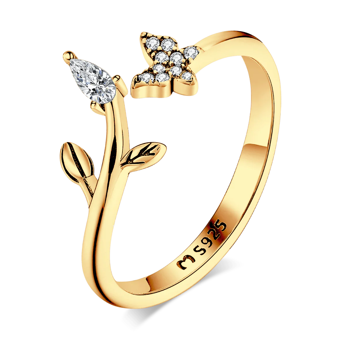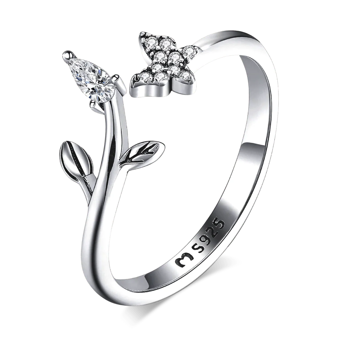Anillo abierto con una mariposa y hojita brillante, que decoran cada uno de sus extremos, en plata de primera ley (S925).