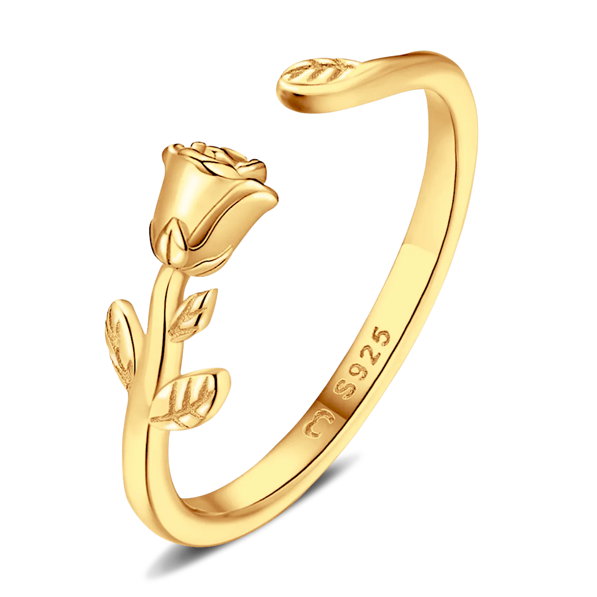 Anillo abierto formado por una rosa con hojitas, como detalle principal, elaborado en plata de primera ley (S925).