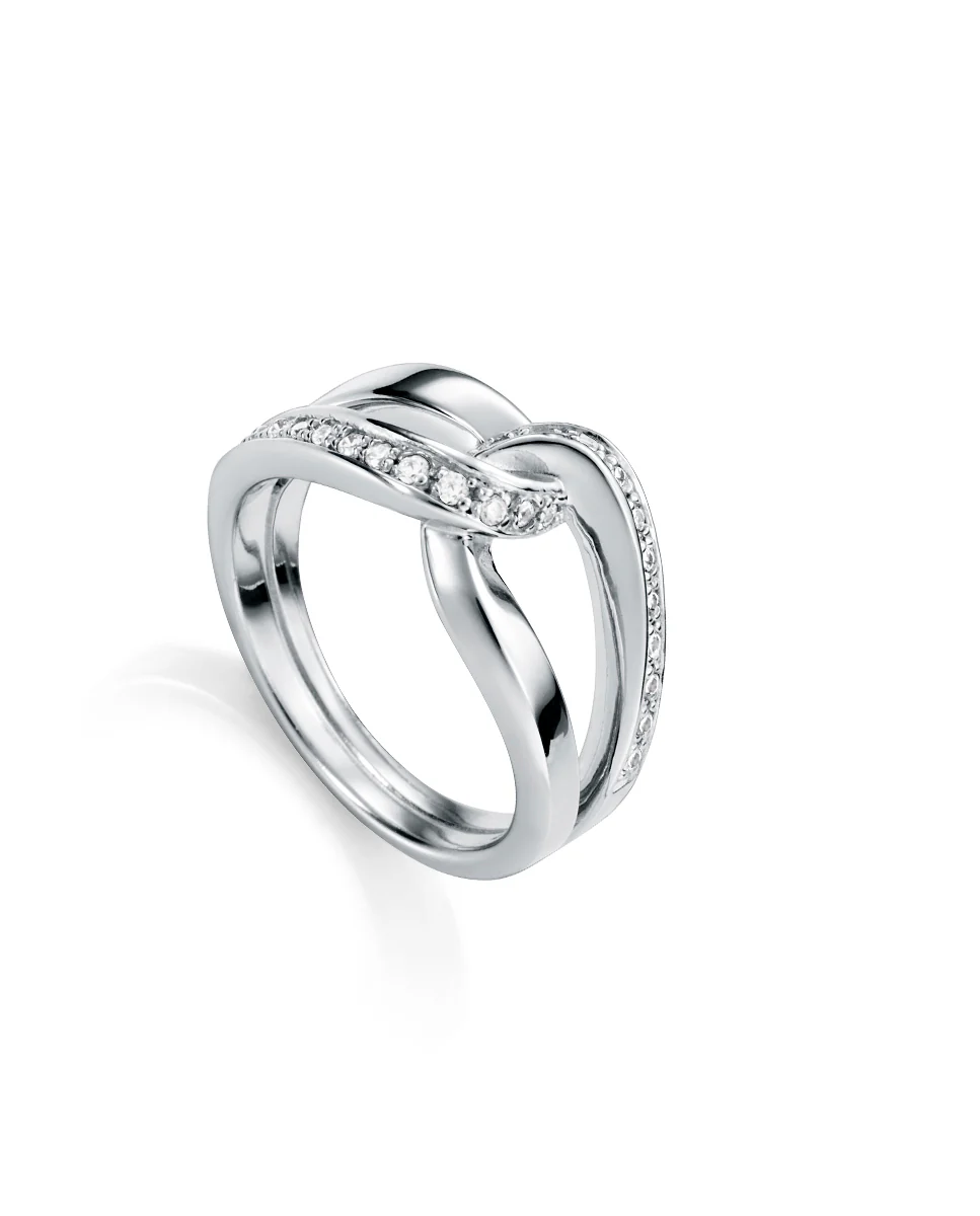 Anillo Viceroy Clásica de plata de primera ley bañada en rodio. Diseño entrelazado con circonitas blancas de 9mm ancho. Disponible en Talla 12 (diámetro interior 16,55 mm), Talla 14 (diámetro interior 17,19 mm), Talla 16 (diámetro interior 17,83 mm), Talla 18 (diámetro interior 18,46 mm).