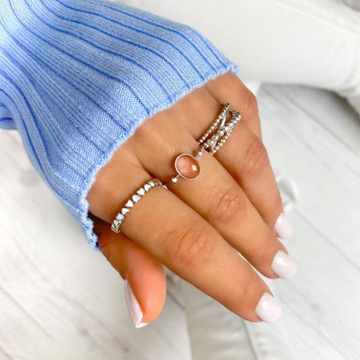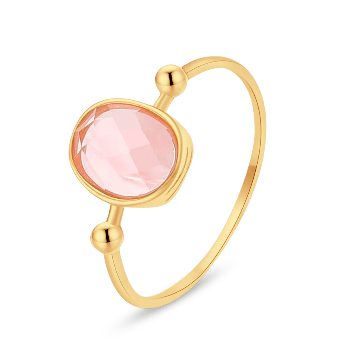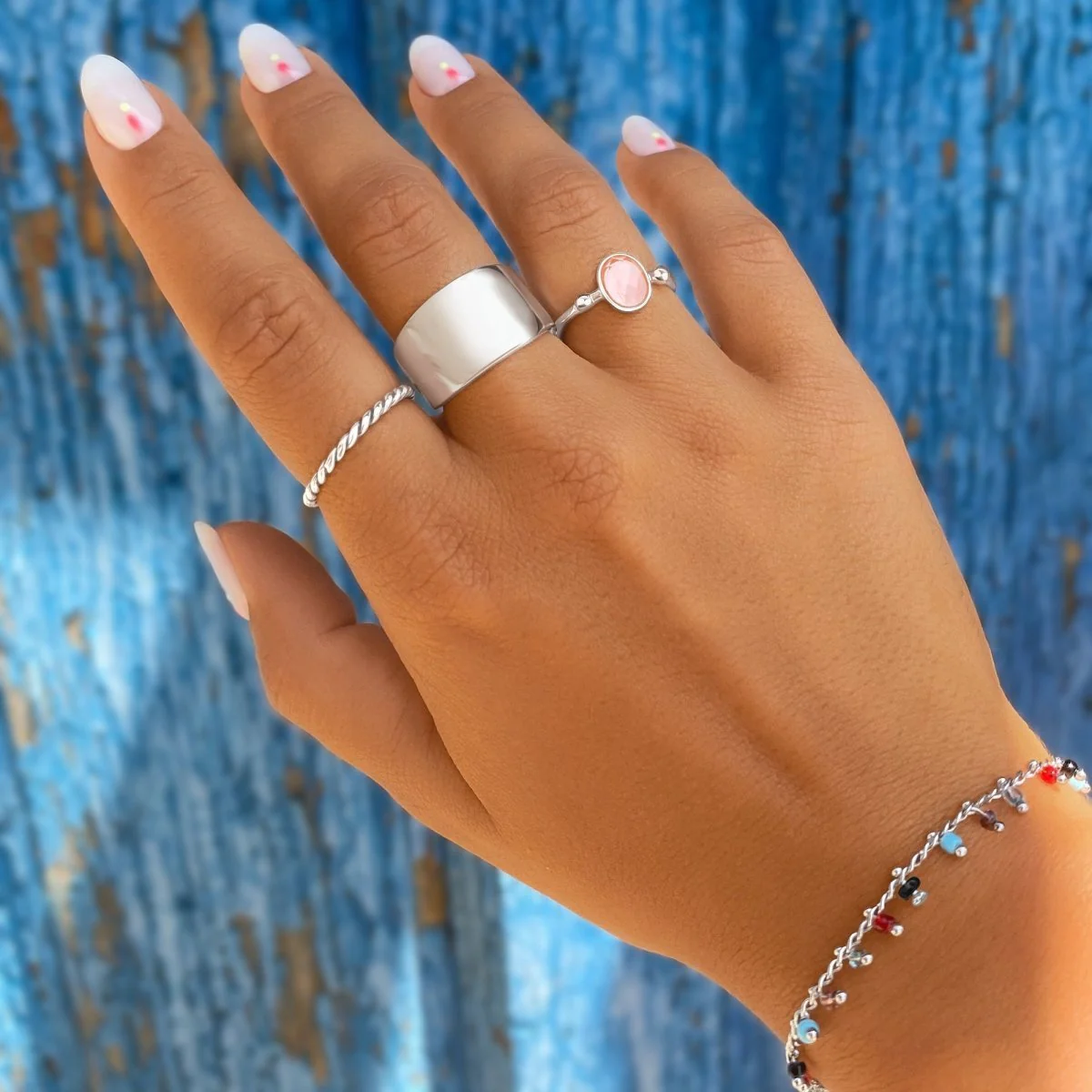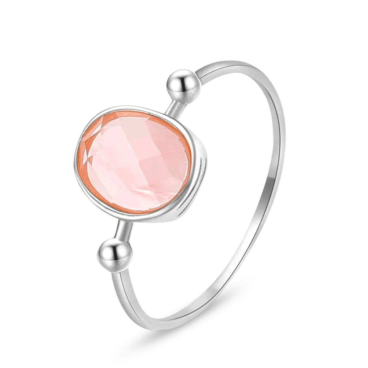 Anillo formado por un espléndido cuarzo rosa en forma oval con dos bolitas ubicadas a los lados, elaborado en plata de primera ley (S925).