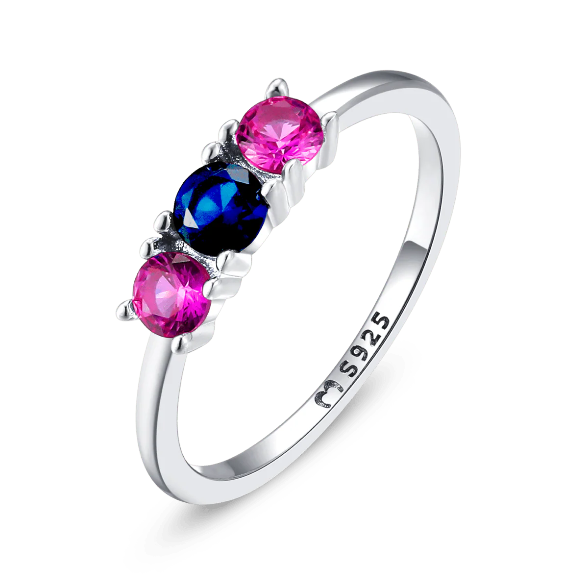 Anillo con 3 preciosas circonitas centradas en color rosa y azul, en representaci贸n al amor, en plata de primera ley (S925).