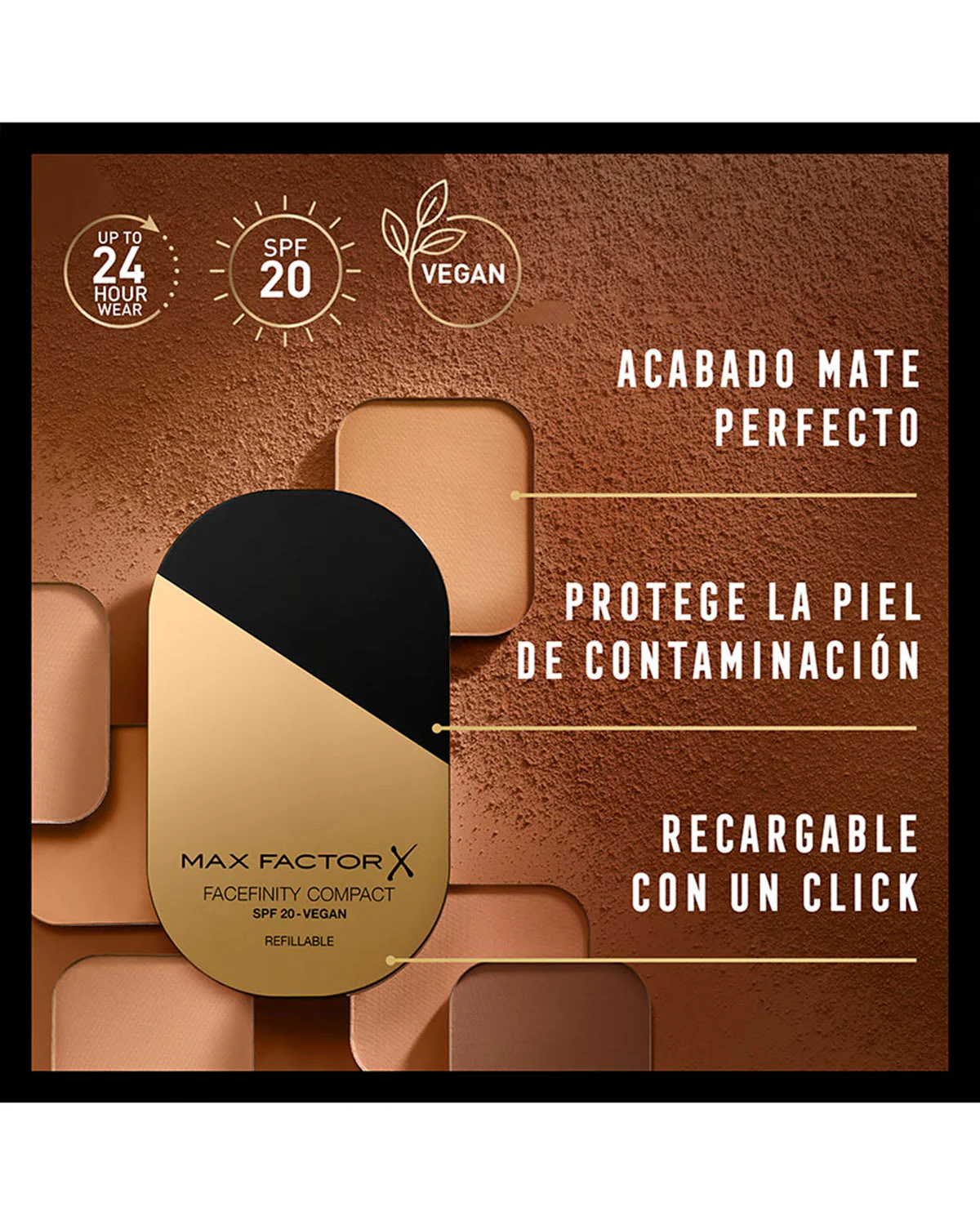 Base vegana en polvo compacto, cobertura perfecta, ultra ligera de acabado mate. Tiene las propiedades de una base líquida. FPS 20.