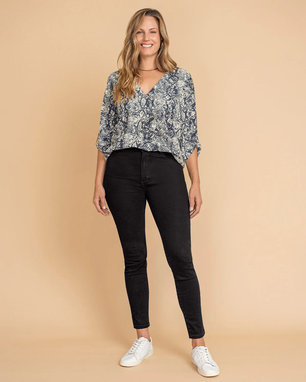 Esta blusa siempre te sacar谩 de apuros. Cuenta con mangas 3/4, cuello en V y recogido con bot贸n en mangas no funcional. Puedes usarla con nuestros jeans o pantalones y ser tu versi贸n favorita.