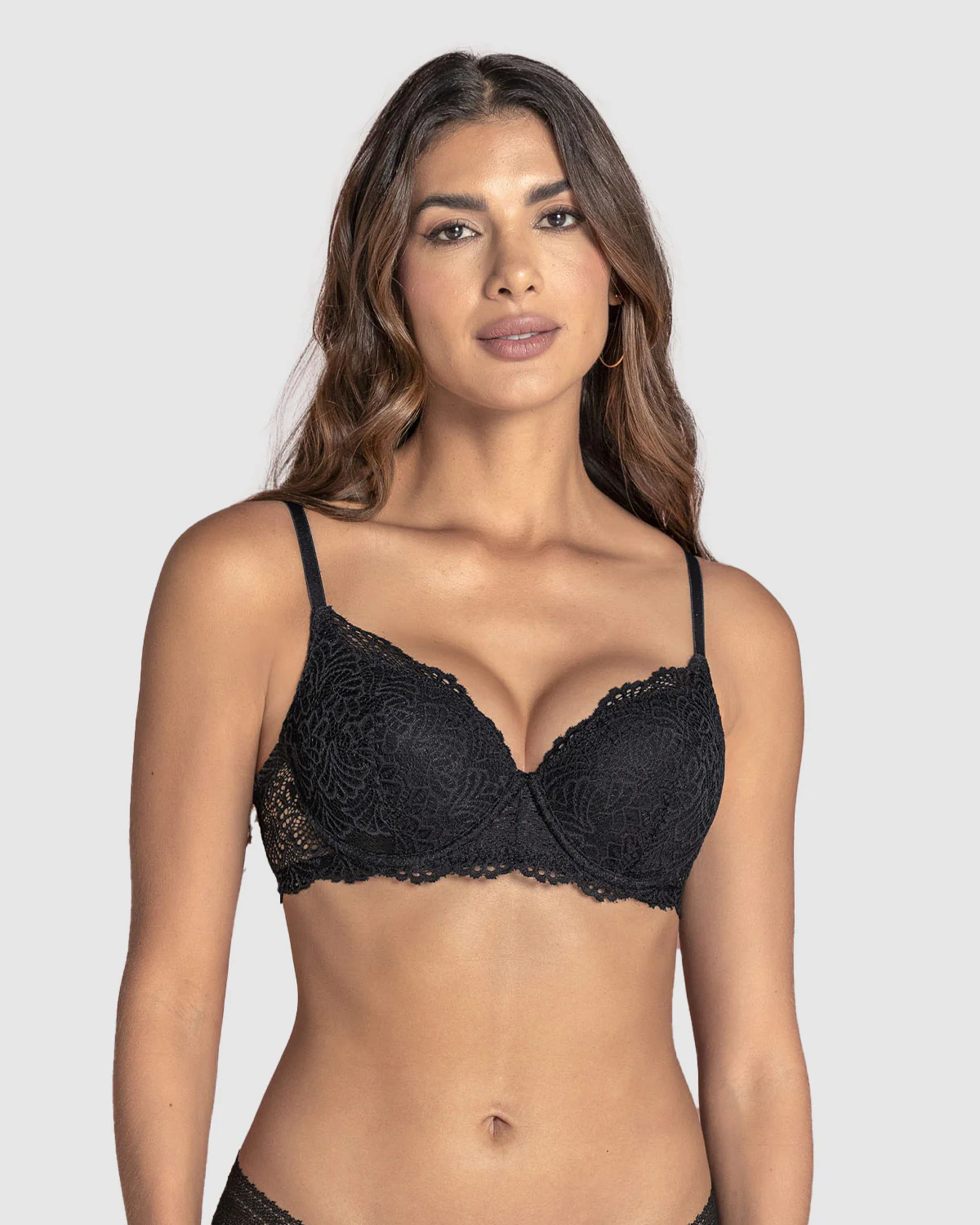 Este brasier est谩 elaborado totalmente en encaje. Tiene copas prehormadas en una espuma suave, ligera y liviana que se adaptan al busto d谩ndole una modelaci贸n redondeada y cuenta con arcos internos, para mejor soporte. Su espalda es delgada, perfecta para aquellas mujeres que buscan poco cubrimiento. Sus cargaderas delgadas y lisas son graduables y removibles para usarlas de forma convencional o cruzadas.