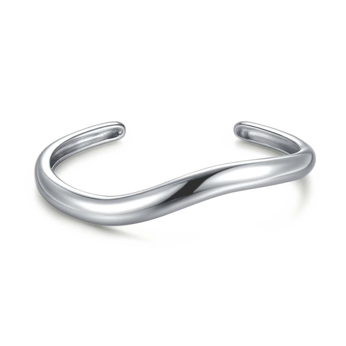 Brazalete rígido, abierto y ajustable de banda fina y en forma ondulada, sin cierre, para poder deslizarse por la muñeca, elaborada en acero inoxidable quirúrgico (316L).