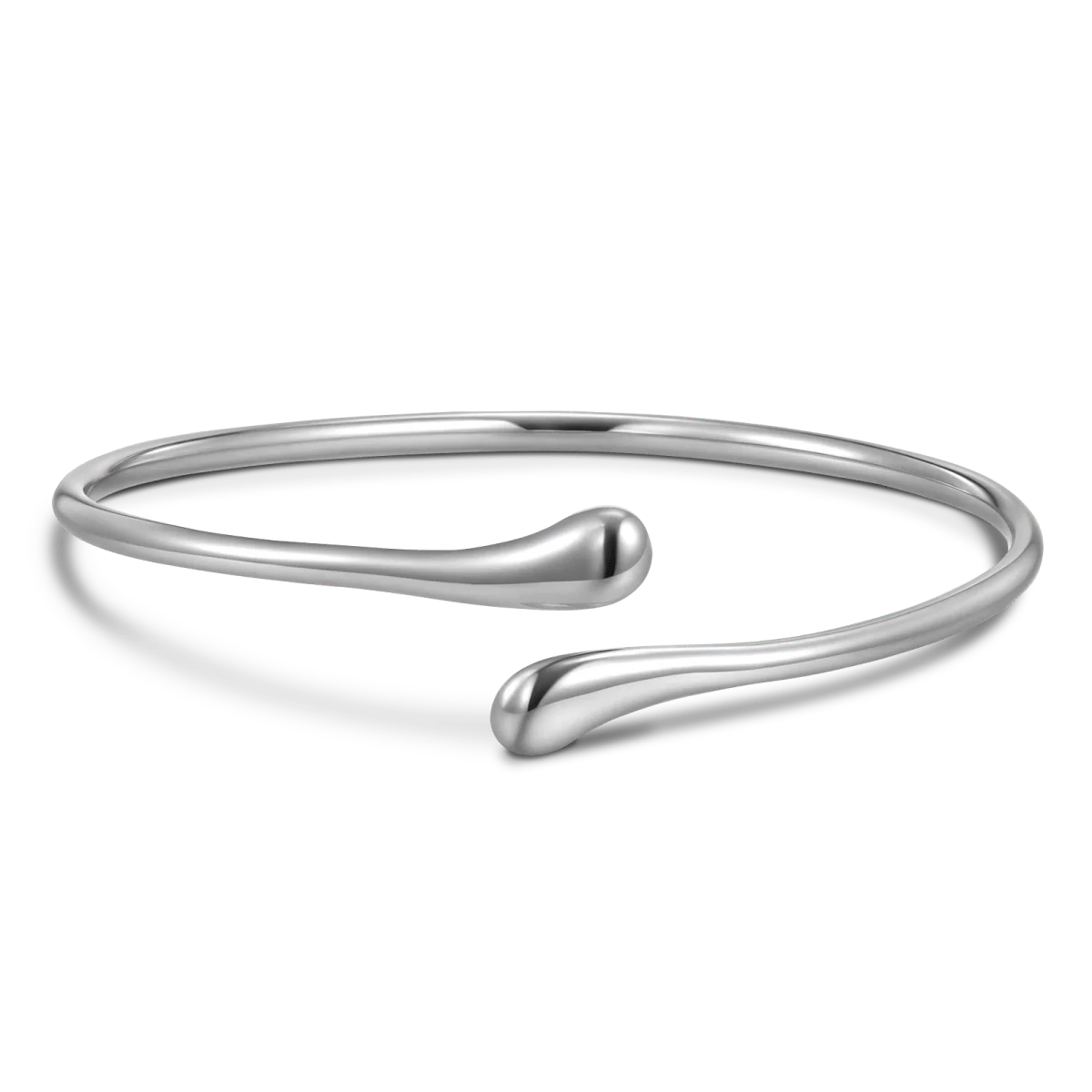 Brazalete fino y abierto con puntas redondeadas en forma de gotas, en acero inoxidable de la mejor calidad (316L).