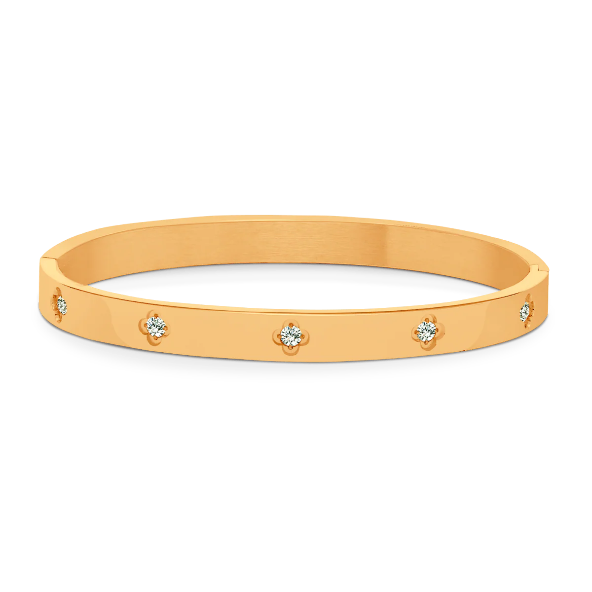 Brazalete rÃgido y amplio para brazo, decorado con flores y circonitas brillantes, en acero inoxidable de la mejor calidad (316L).