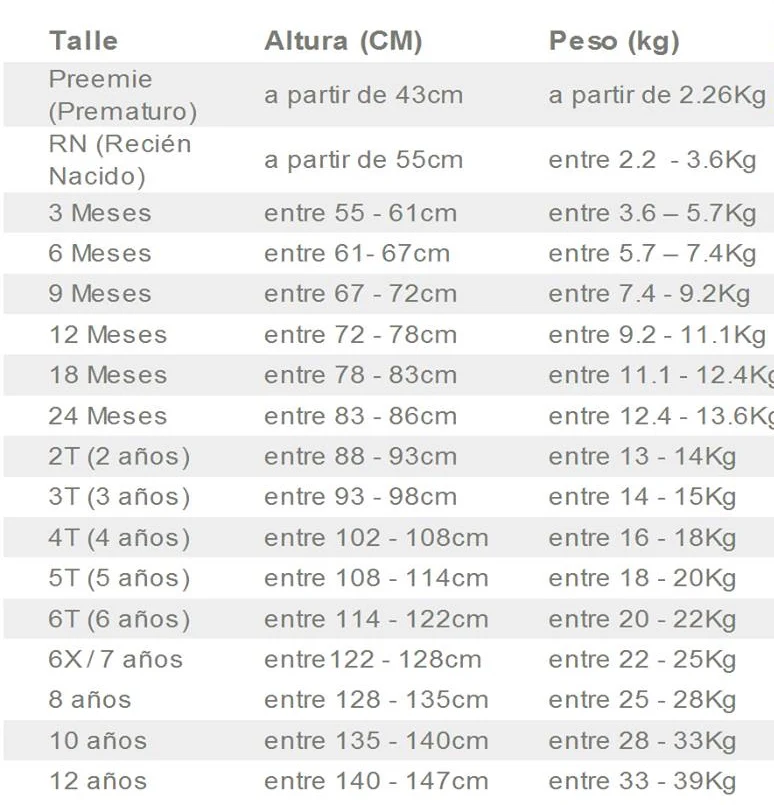 | Tamaño | 12-18 meses, 18-24 meses, 2 años, 3 años, 4 años, 5 años, 6-8/XS años, 8-10/S años |