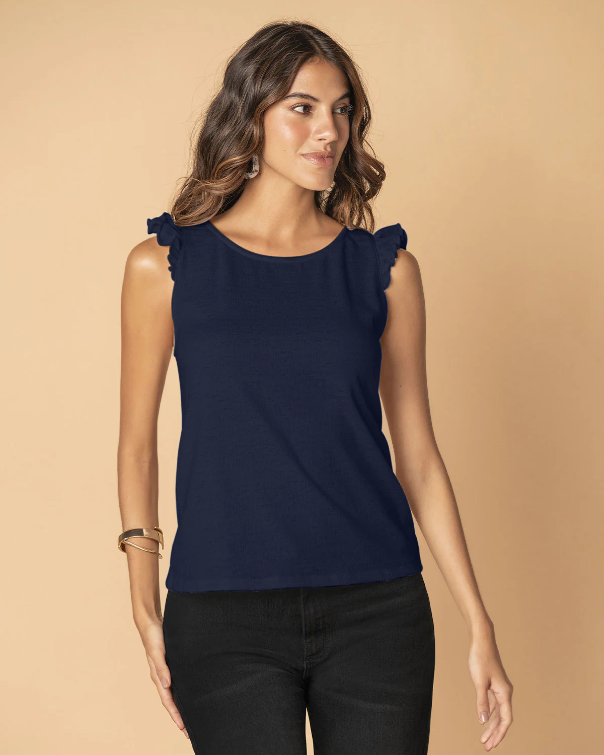 Los detalles nos enamoran cada vez más y el vuelo en borde en esta camiseta manga sisa, es un ítem especial que hace que esta prenda sea única y muy femenina. ¡Úsala para diferentes ocasiones, queda muy bien con todo!