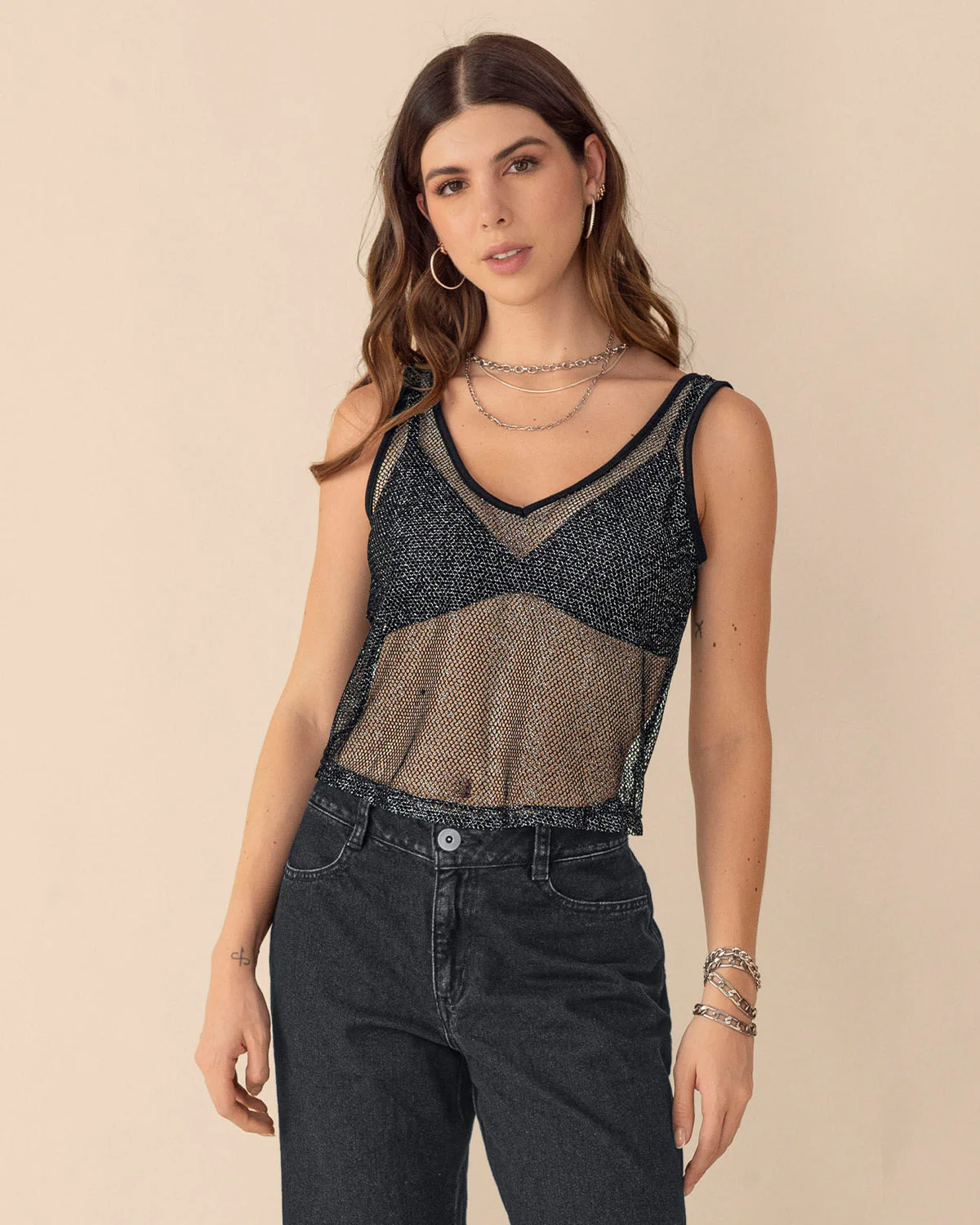 Esta camiseta manga sisa redefine el significado de las transparencias, elaborada en malla con brillo hará que destaques con un look muy cool y sexy a la vez. ¡Es la prenda ideal para esos momentos en que quieres robar todas las miradas!