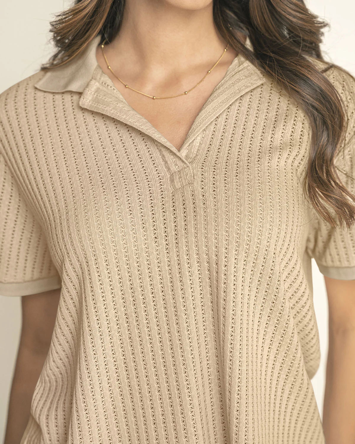¡Un clásico que volvió renovado! Esta camiseta tipo polo en tejido de punto lo tiene todo: cuello y mangas con rayas en contraste y botones sin botones que le dan un aire sporty-chic. Su fit regular la hace súper fácil de llevar, ya sea con jeans o con una falda para un look más cool. Un básico renovado que vas a querer usar una y otra vez.