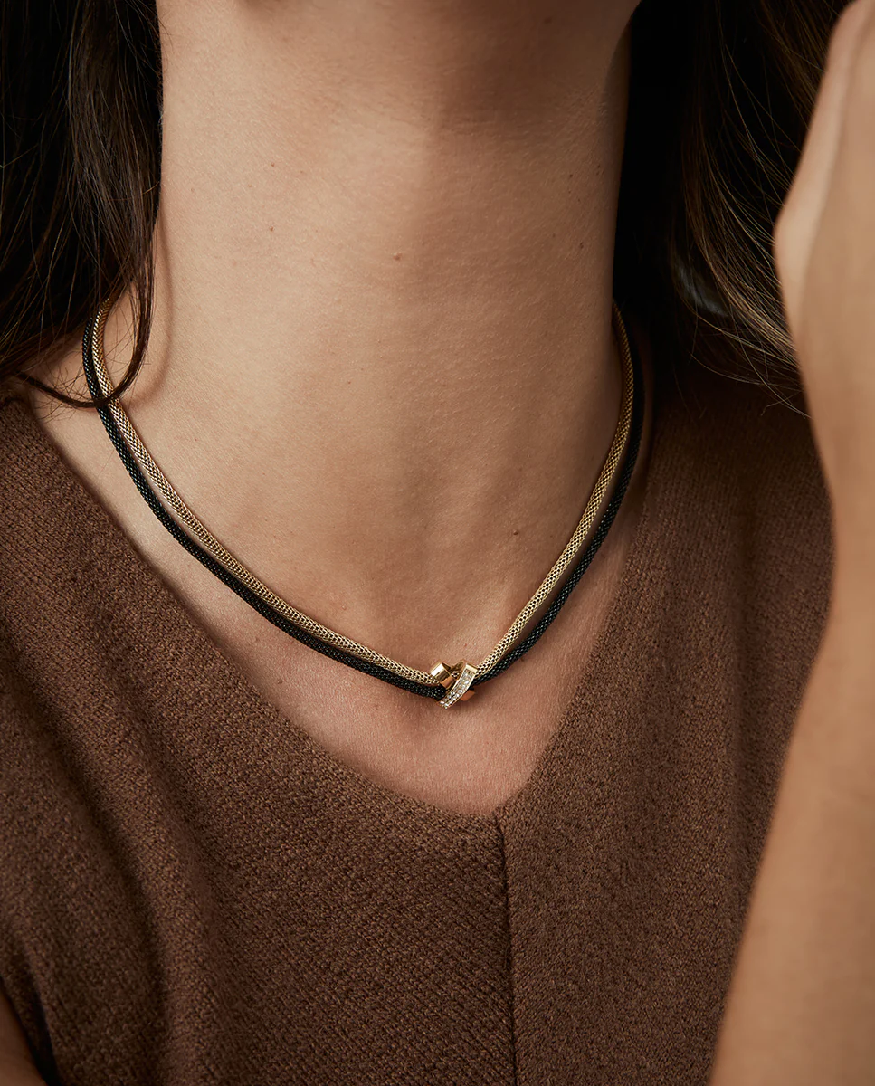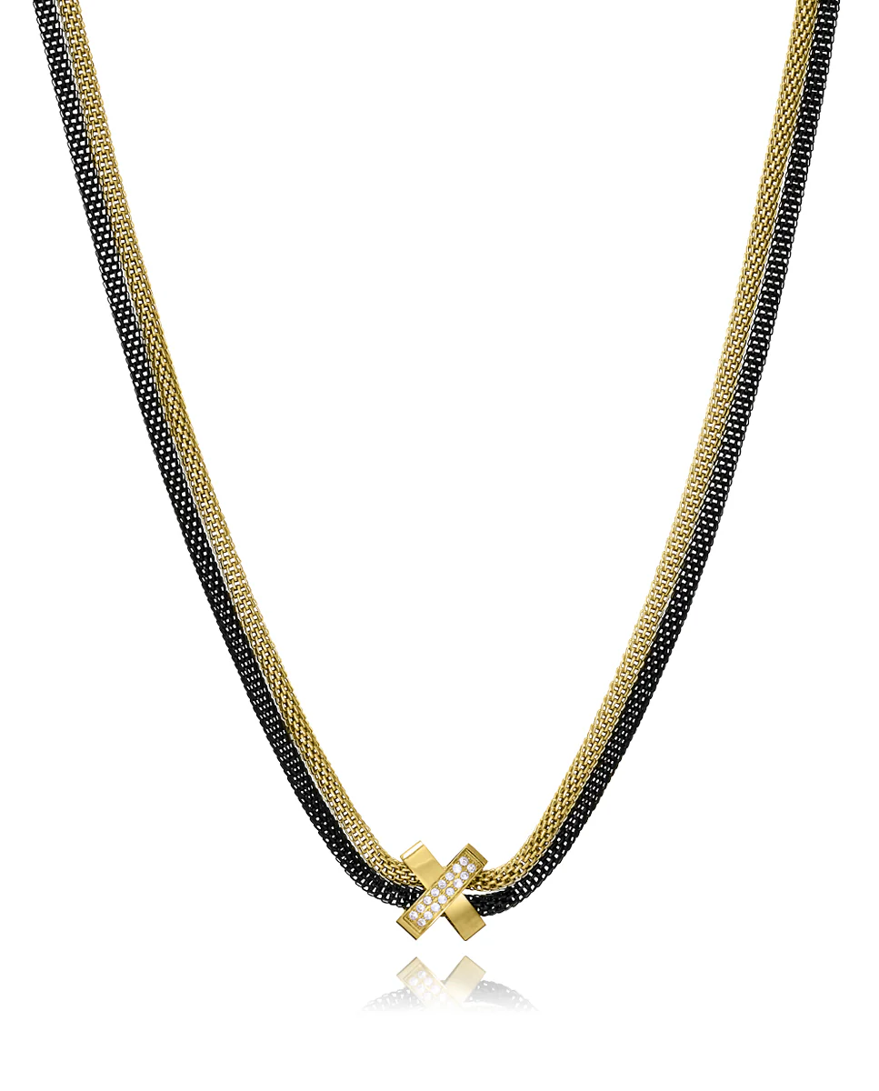 Un collar que combina elegancia moderna y sofisticación en un diseño único. Fabricado en acero con un acabado IP dorado y negro, presenta un diseño de doble esterilla redonda con una X central adornada con circonitas blancas que aportan un brillo sutil y refinado. El contraste entre el dorado, el negro y las circonitas crea una pieza armoniosa que captura la atención. Con un largo de 45 cm más 5 cm de extensión, se ajusta perfectamente a diferentes estilos y escotes. Ideal para mujeres que buscan una joya audaz, sofisticada y llena de distinción para cualquier ocasión.