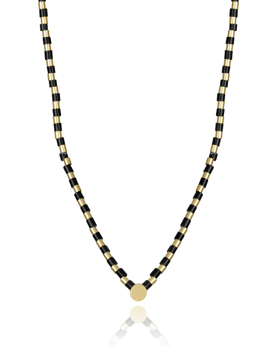 Este elegante collar de acero con acabado IP dorado está decorado con piedras naturales de ágata negra, aportando un toque de sofisticación y profundidad. Perfecto para cualquier ocasión. El contraste entre el dorado y el ágata negra crea un equilibrio armonioso, ideal para complementar looks tanto diarios como formales. Una pieza versátil y con carácter para la mujer moderna. Largo 42 + 3 cm.
