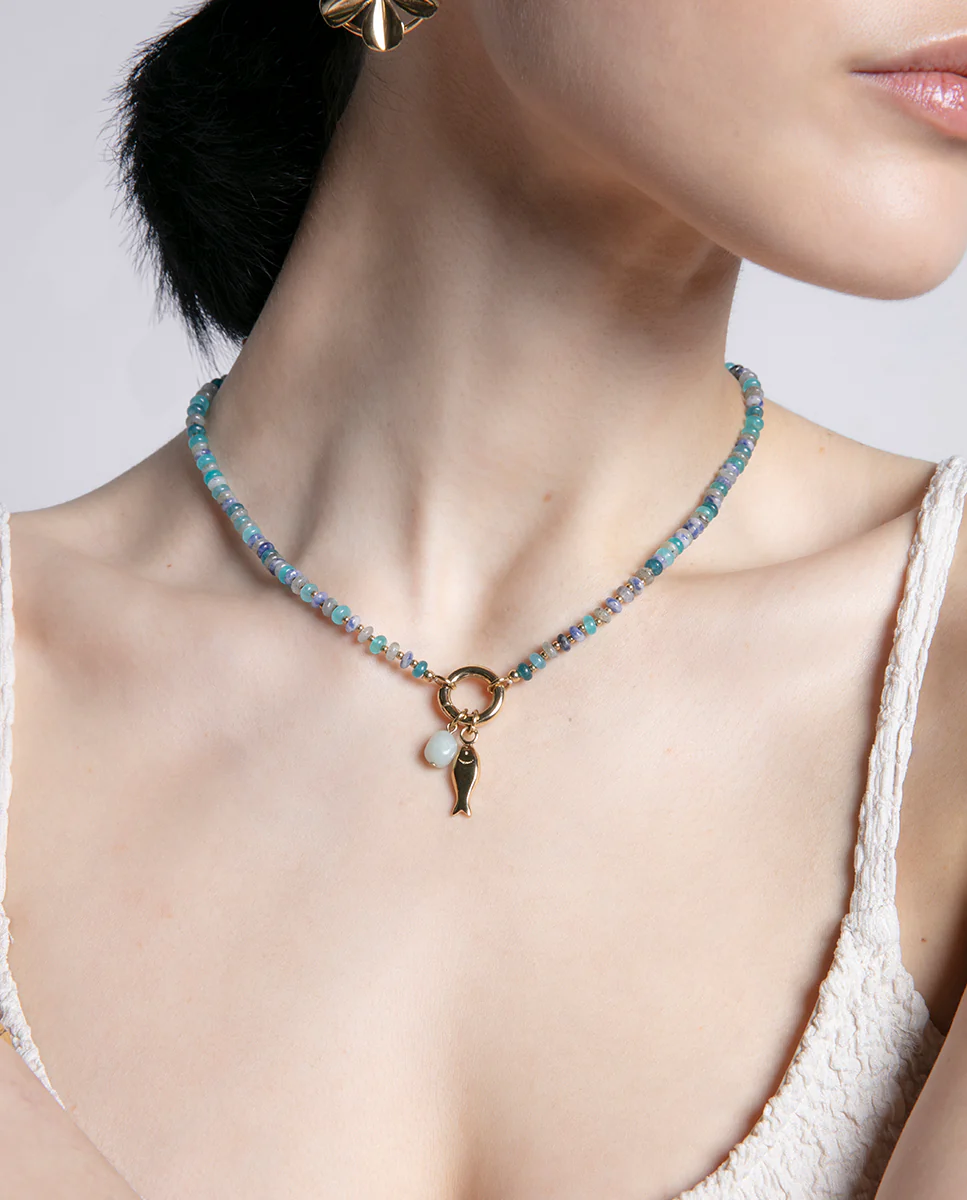 Hermoso collar de acero con piedras naturales y colgante de pez dorado. Complementos con esencia dotan a tus looks de personalidad y vida. Marca la diferencia con una joya nacida para ello. Único de Viceroy. Longitud: 42,3 + 2 cm.