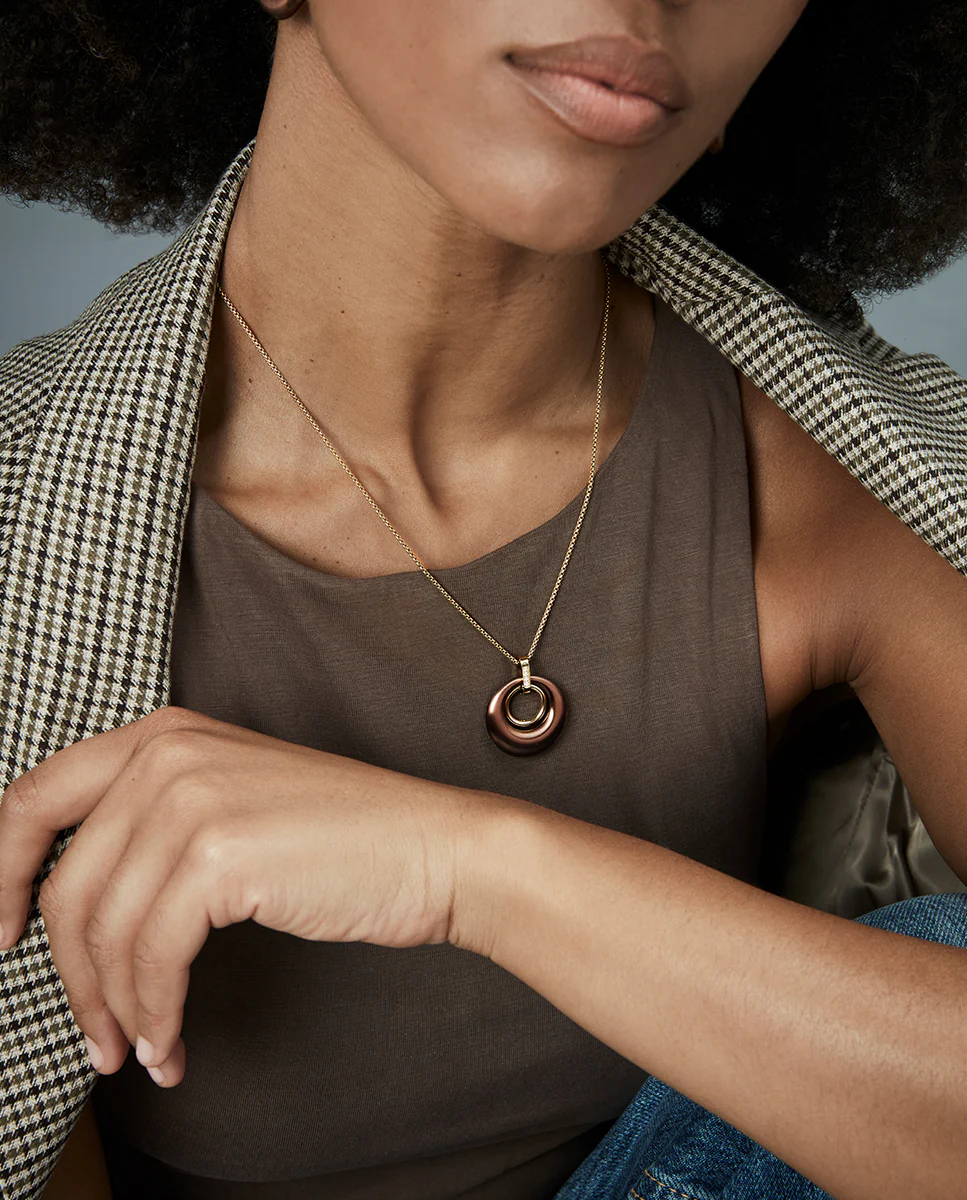 Un collar que irradia sofisticación y modernidad con un toque de lujo. Fabricado en acero con acabados IP marrón y dorado, presenta circonitas blancas que aportan un brillo delicado y elegante. Los aros colgantes añaden un toque dinámico y contemporáneo al diseño, creando una pieza versátil que se adapta a diferentes estilos y ocasiones. Con un largo de 42 cm más 3 cm de extensión, se ajusta perfectamente a diferentes escotes, convirtiéndolo en un accesorio ideal para realzar cualquier look con un toque de distinción y luminosidad. Perfecto para mujeres que buscan un collar único, lleno de estilo y elegancia.