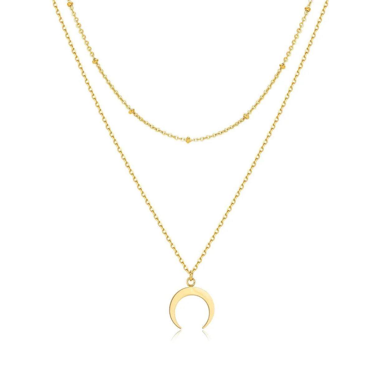 Collar de doble cadenita fina con bolitas y media luna, para ajustar a tu gusto, en acero inoxidable de la mejor calidad (316L).
