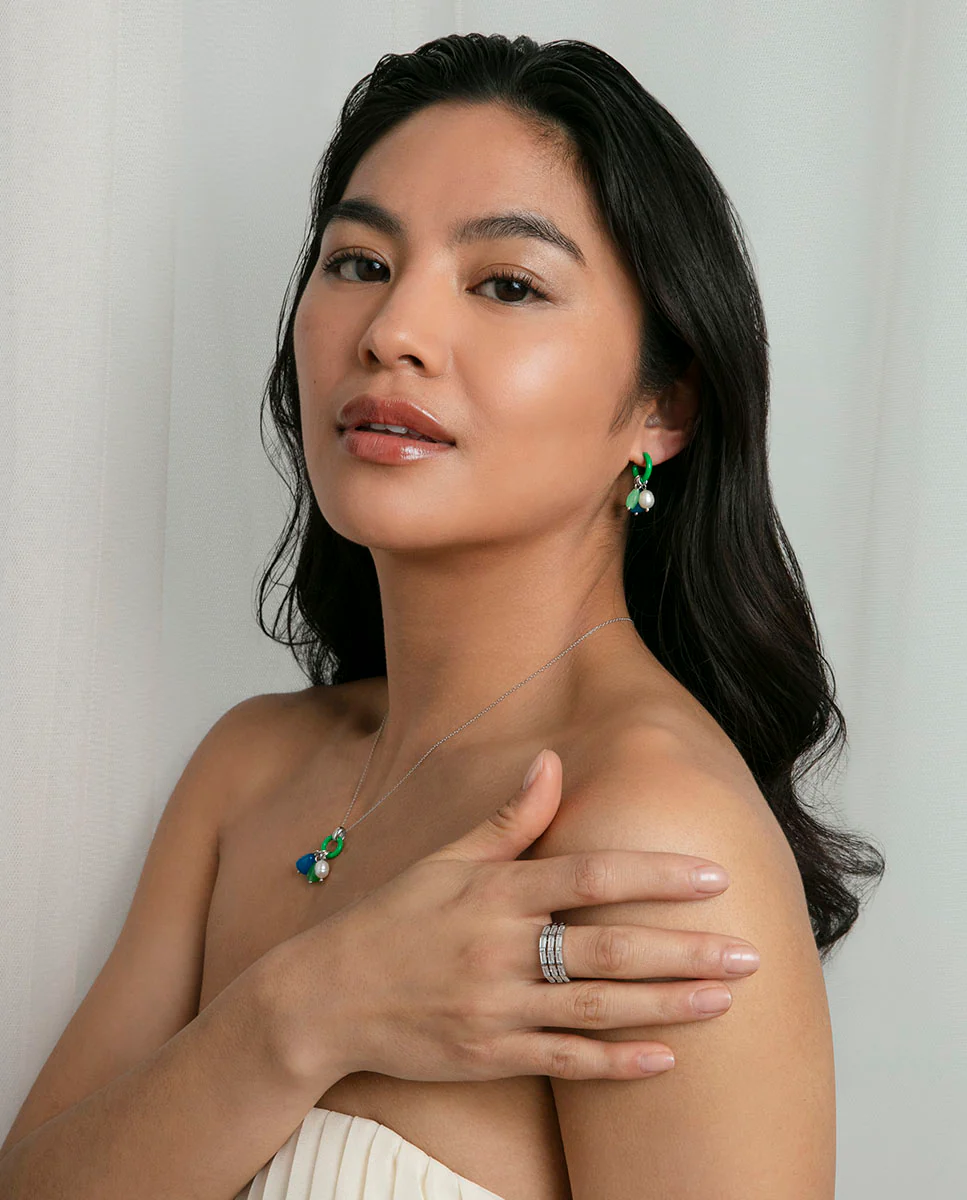 Collar de plata de primera ley con baño de rodio es una pieza que irradia frescura y sofisticación. Su elegante aro, adornado con esmalte verde, sirve de base para las piedras naturales colgantes que aportan un toque de color y textura únicos. Con un largo de 42 cm más 3 cm de extensión, es una joya versátil que puedes llevar tanto en tu día a día como en ocasiones especiales. Una creación de Viceroy que combina naturaleza y diseño en una pieza llena de personalidad.