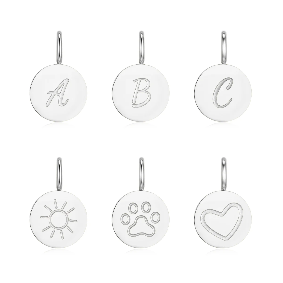 Collar de cadenita fina, para elegir individual o combinar con colgantitos circulares de letras iniciales o s铆mbolos de sol, media luna, coraz贸n y huella de mascota. Todos los colgantes cuentan con un arito para insertar en la cadena, elaborado en acero quir煤rgico de alta calidad (316L).