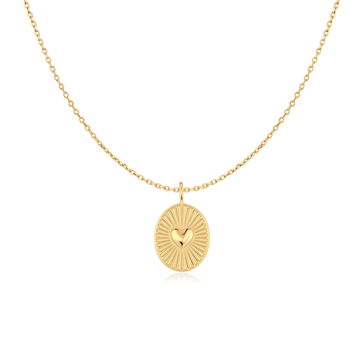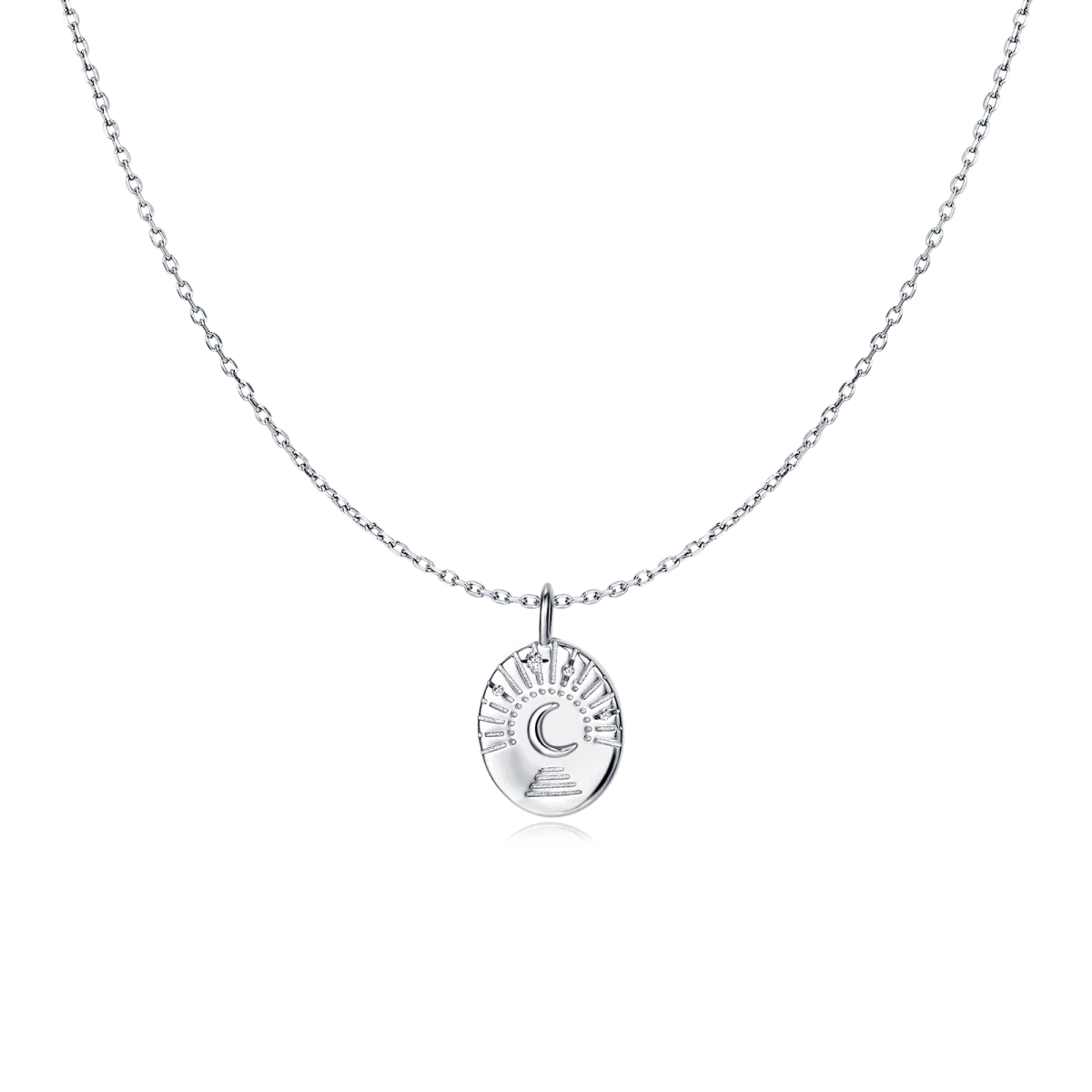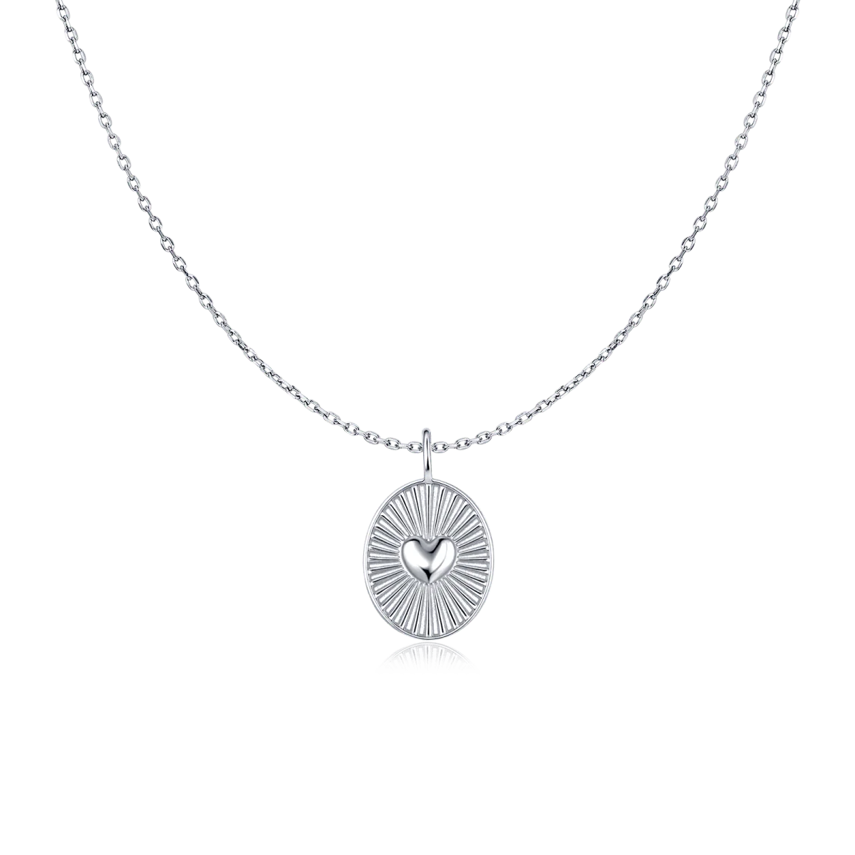 Collar con colgante de medalla ovalada reversible, una de sus caras cuenta con líneas radiales y un corazón abombado en el centro, en combinación con una media luna y patrones de rayos solares, decorado con pequeños puntos y circonitas brillantes, en representación a la luz y la oscuridad, elaborado en plata de primera ley (S925).