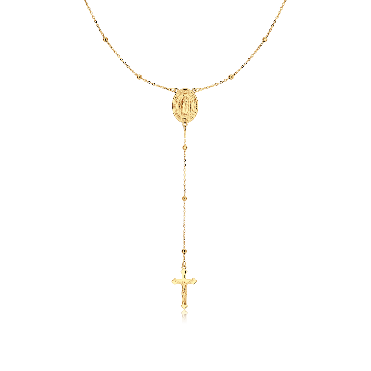 Collar fino y alargado de doble colgante con medalla sagrada de la virgen María acompañada de Jesucristo, como símbolos del cristianismo, de la pureza y el sacrificio, elaborado en plata de primera ley (S925).