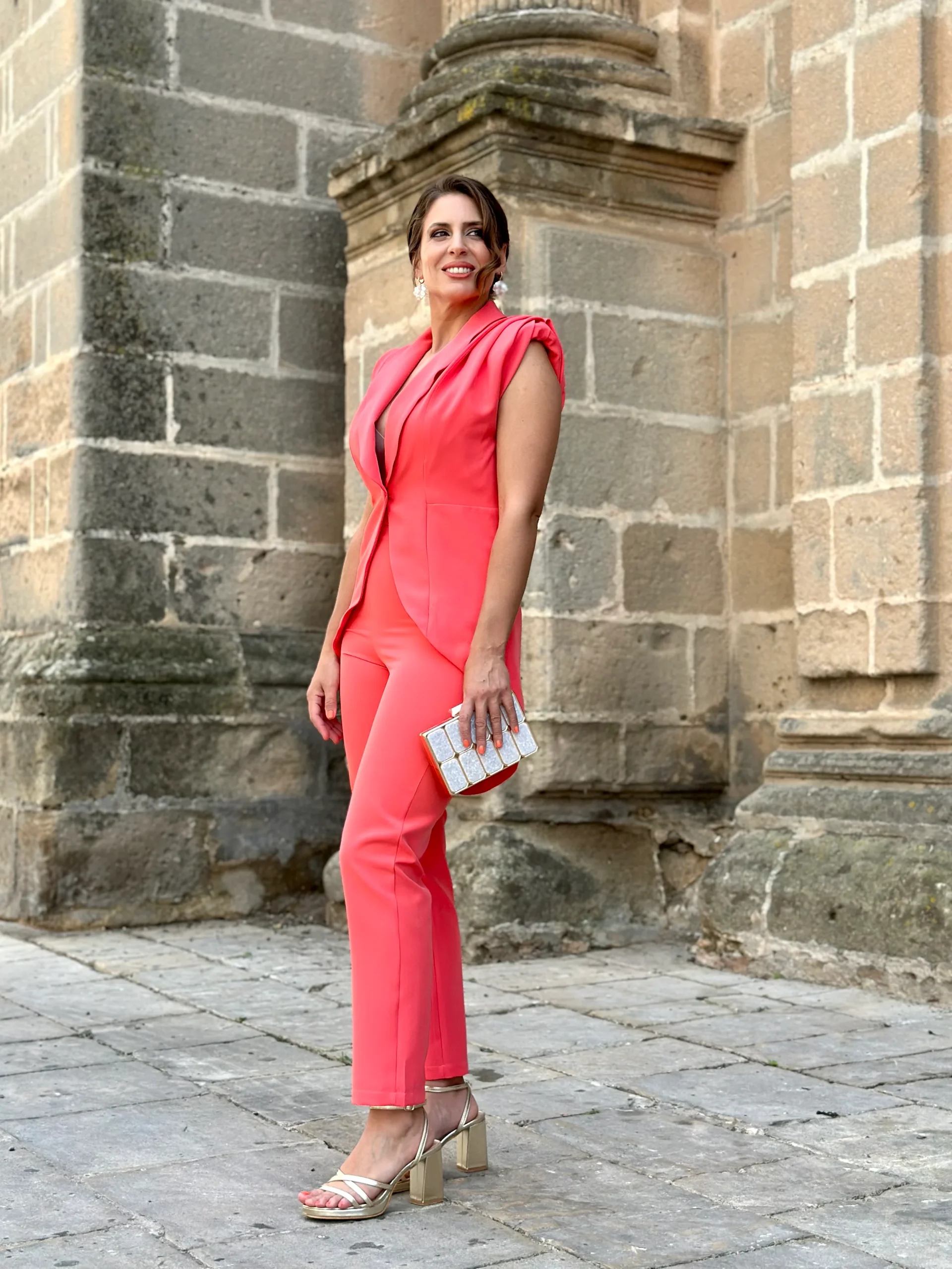 El tejido satinado le da ese toque de luz perfecto para eventos de día o de noche. Un look total que estiliza, alarga la figura y transmite fuerza, elegancia y personalidad.