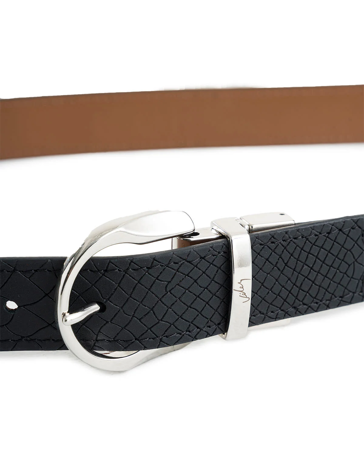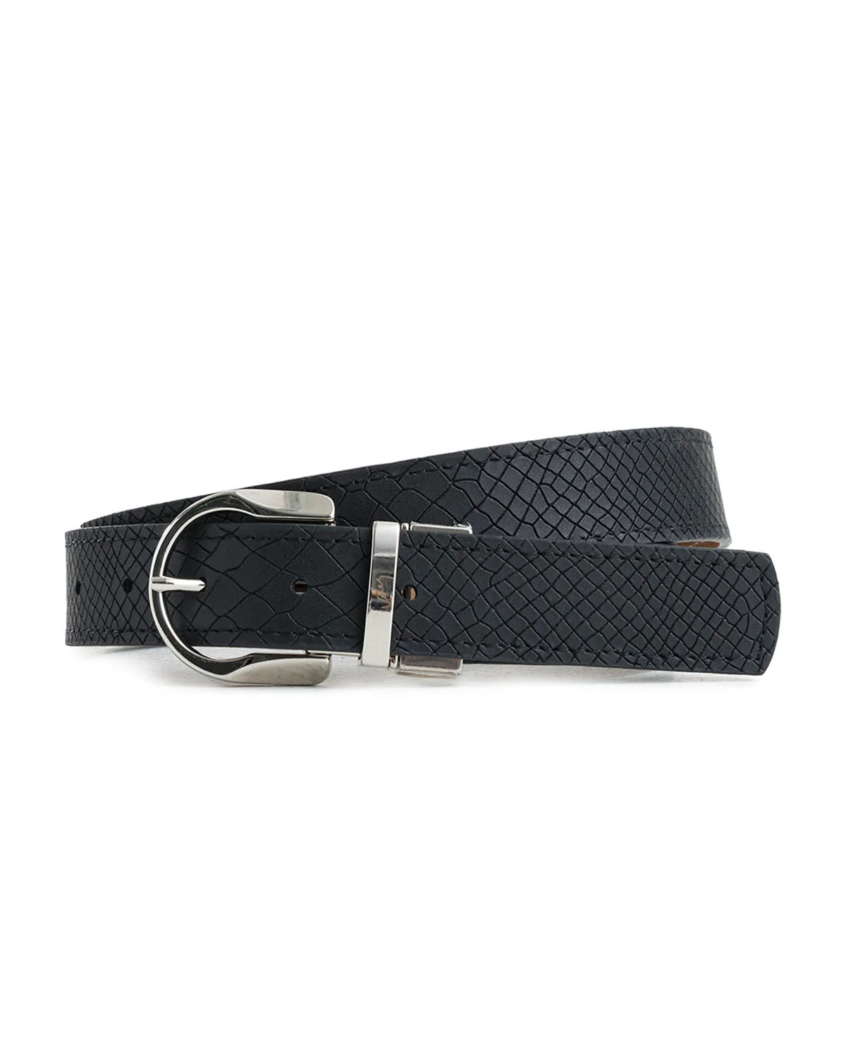 Diseñado para resaltar la feminidad con elegancia y versatilidad, nuestro cinturón está elaborado en cuero liso por un lado y cuero grabado por el otro. Su funcionalidad doble faz lo convierte en un accesorio ideal para crear todo tipo de outfits con sus diseños atributos: – Cinturón doble faz versátil – Un lado de cuero liso – Ancho de 30 mm – Un lado de cuero grabado con placa serpiente – Marcación Vélez firma en el pasador – Costuras en los bordes de ambos lados – Se puede cortar a medida en tiendas Vélez. Medidas: 3 cm.