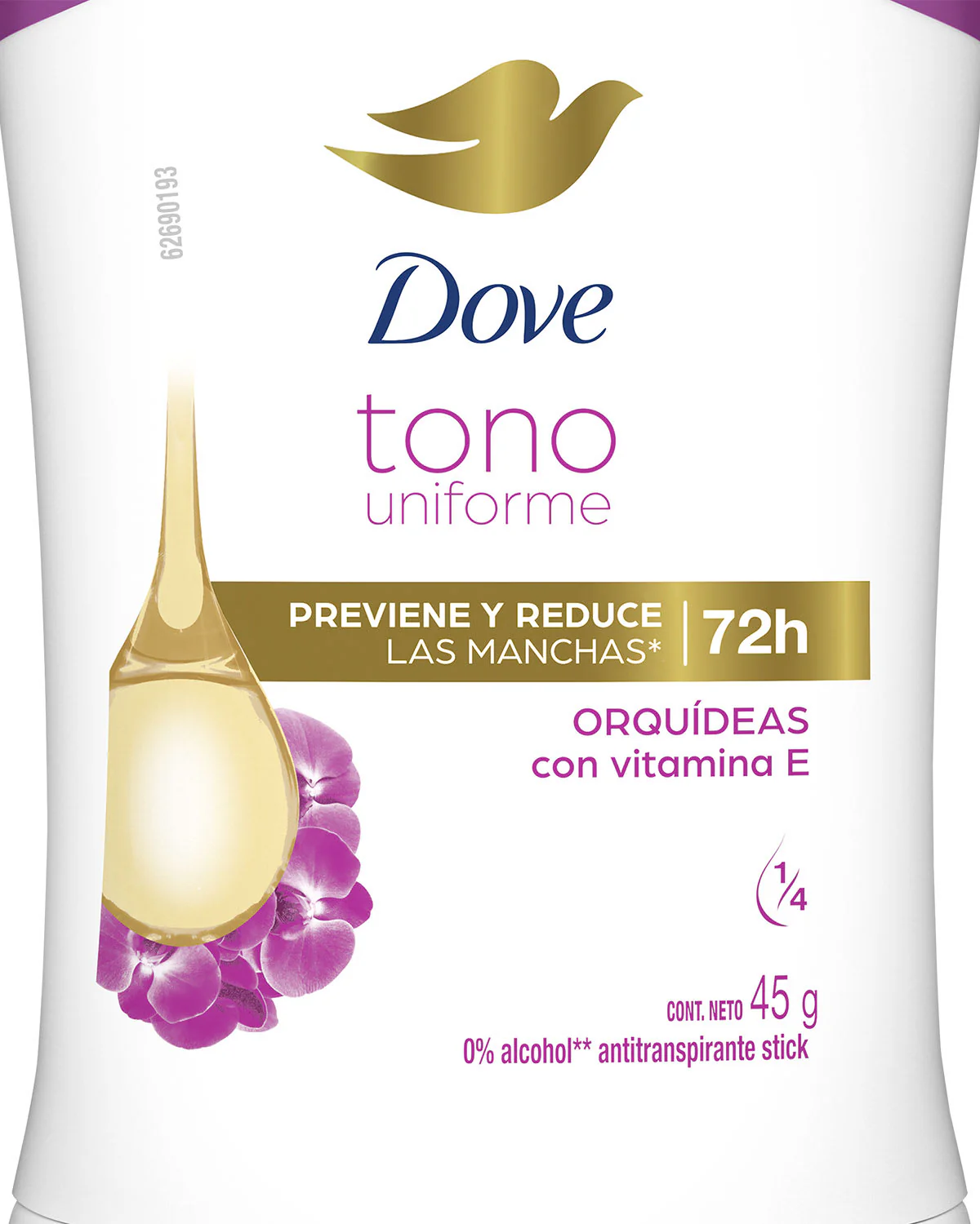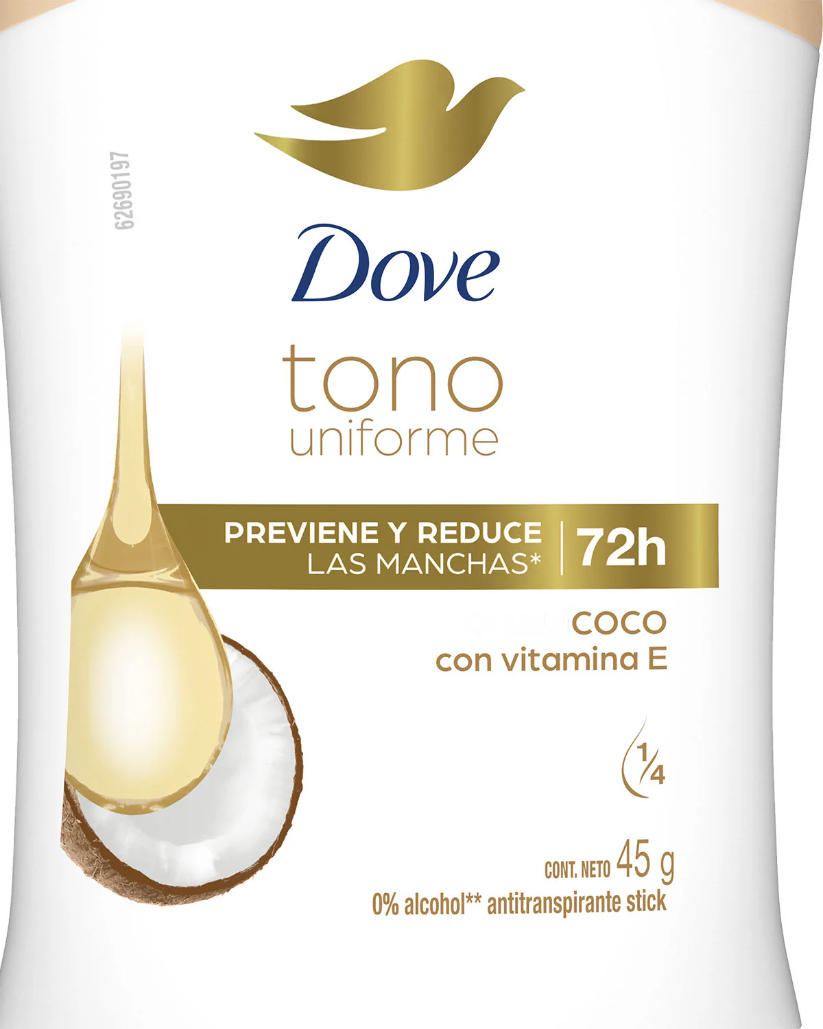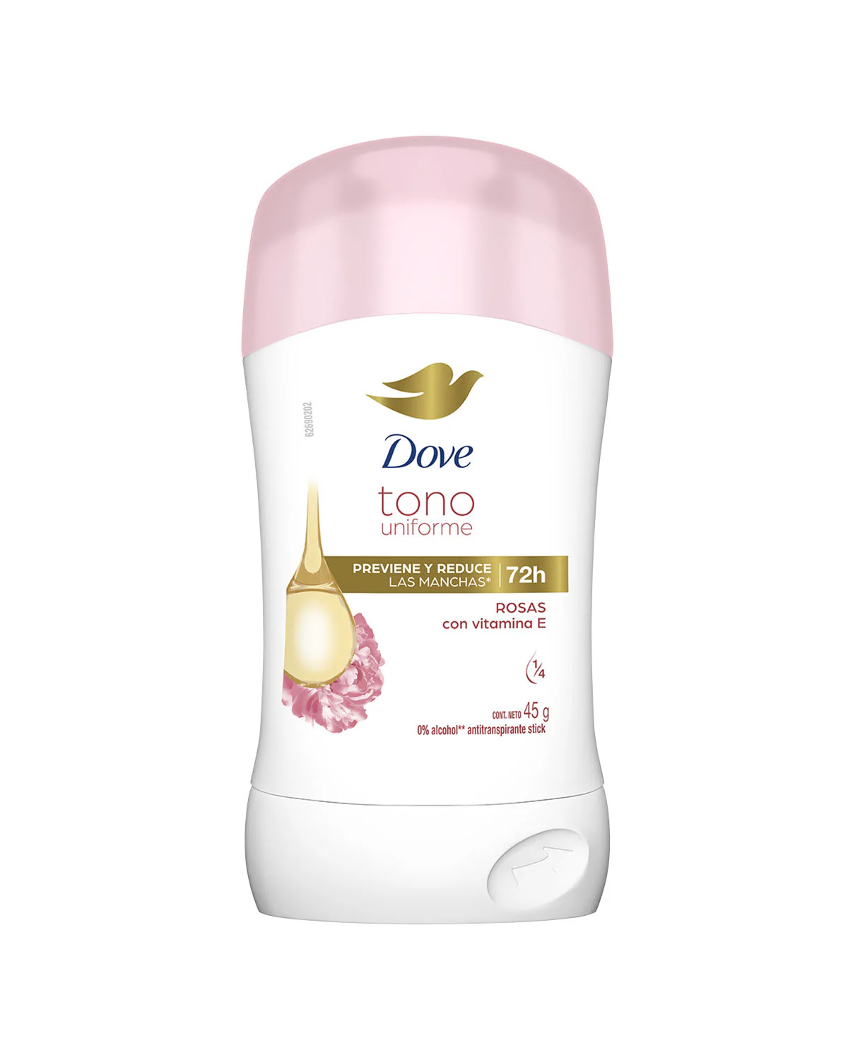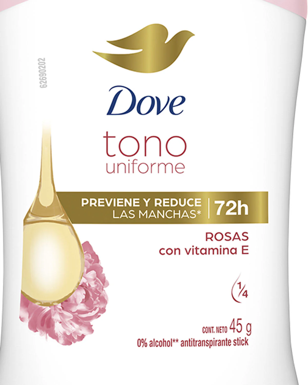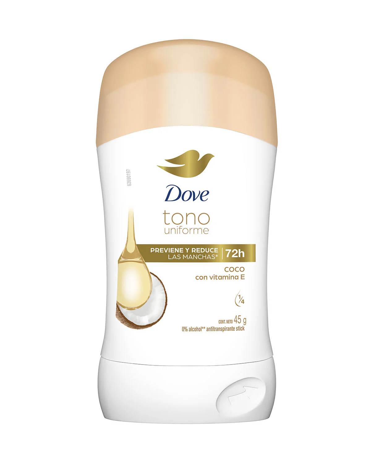 Dove cree que el tono natural de tus axilas es tu mejor tono, por eso te ayuda a recuperarlo* con su l铆nea Dove tono uniforme. Previene y reduce las manchas en tus axilas, recuperando el tono natural de tu piel. 45 g.