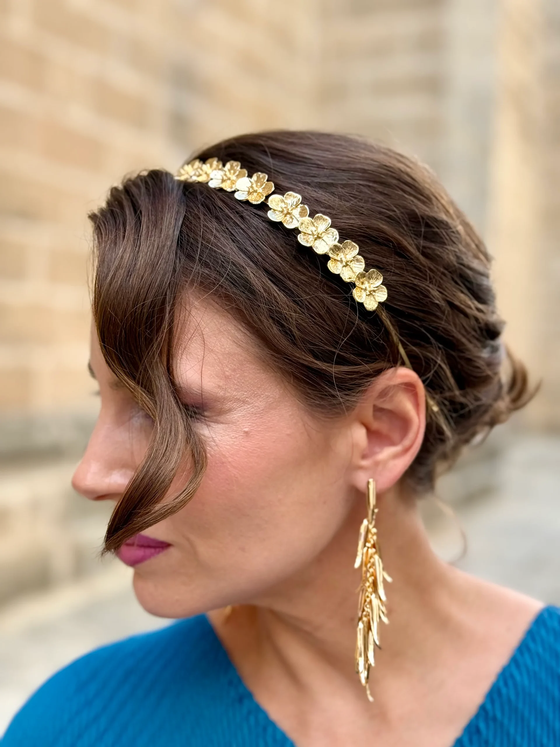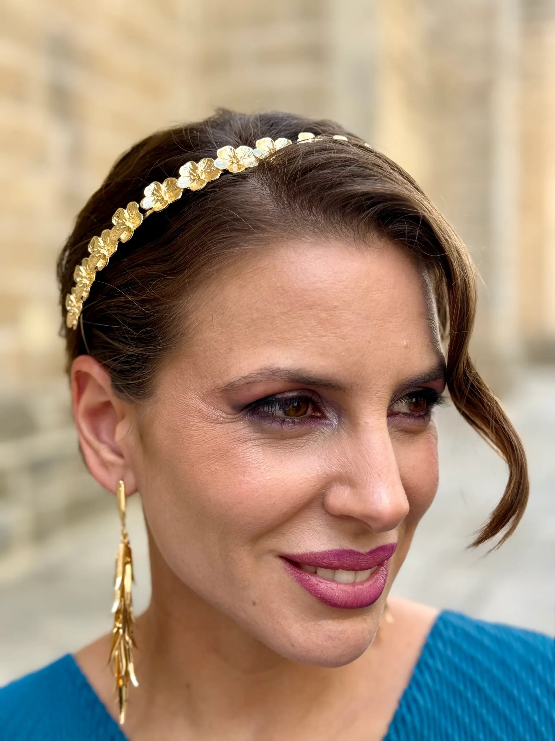 Diadema dorada con delicadas hojas en forma de abanico o ginkgo, que le dan un aire sofisticado y original. Es ideal para destacar en eventos elegantes, aportando un toque artístico y único al peinado, perfecto para invitadas que buscan diferenciarse con estilo.
