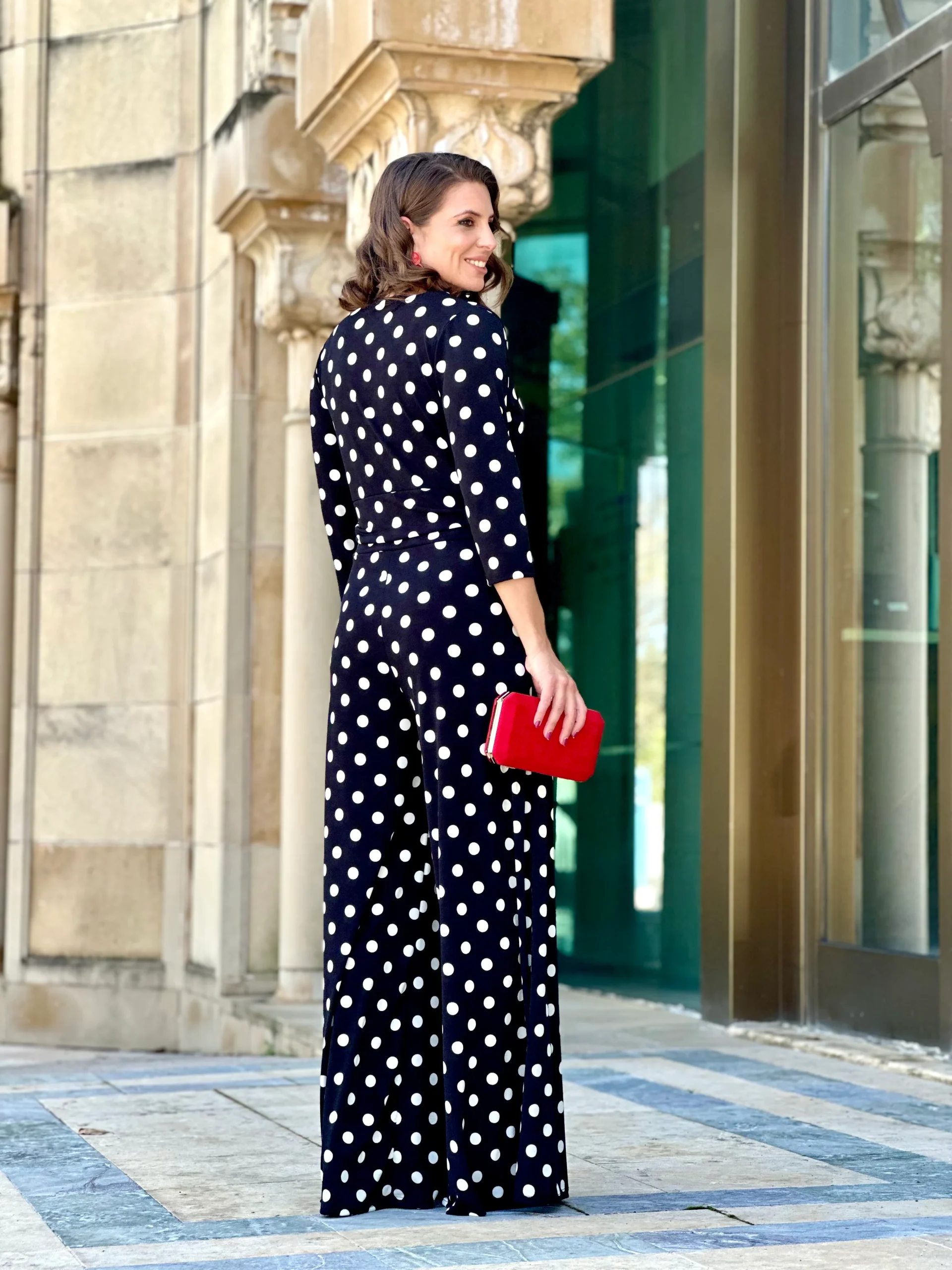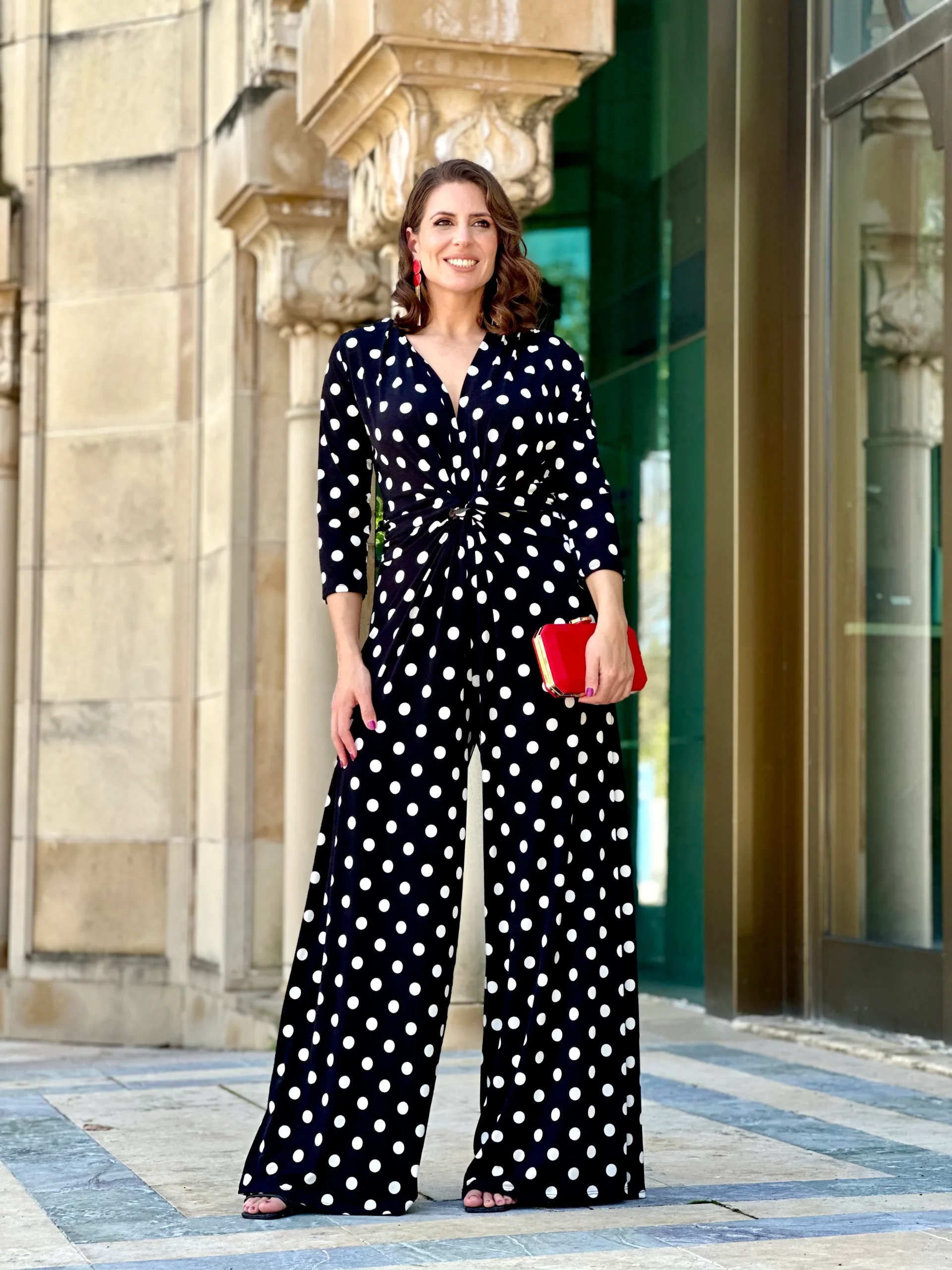 Mono con escote en V, detalle de nudo en la cintura, pantalón de pata ancha con suave caída.