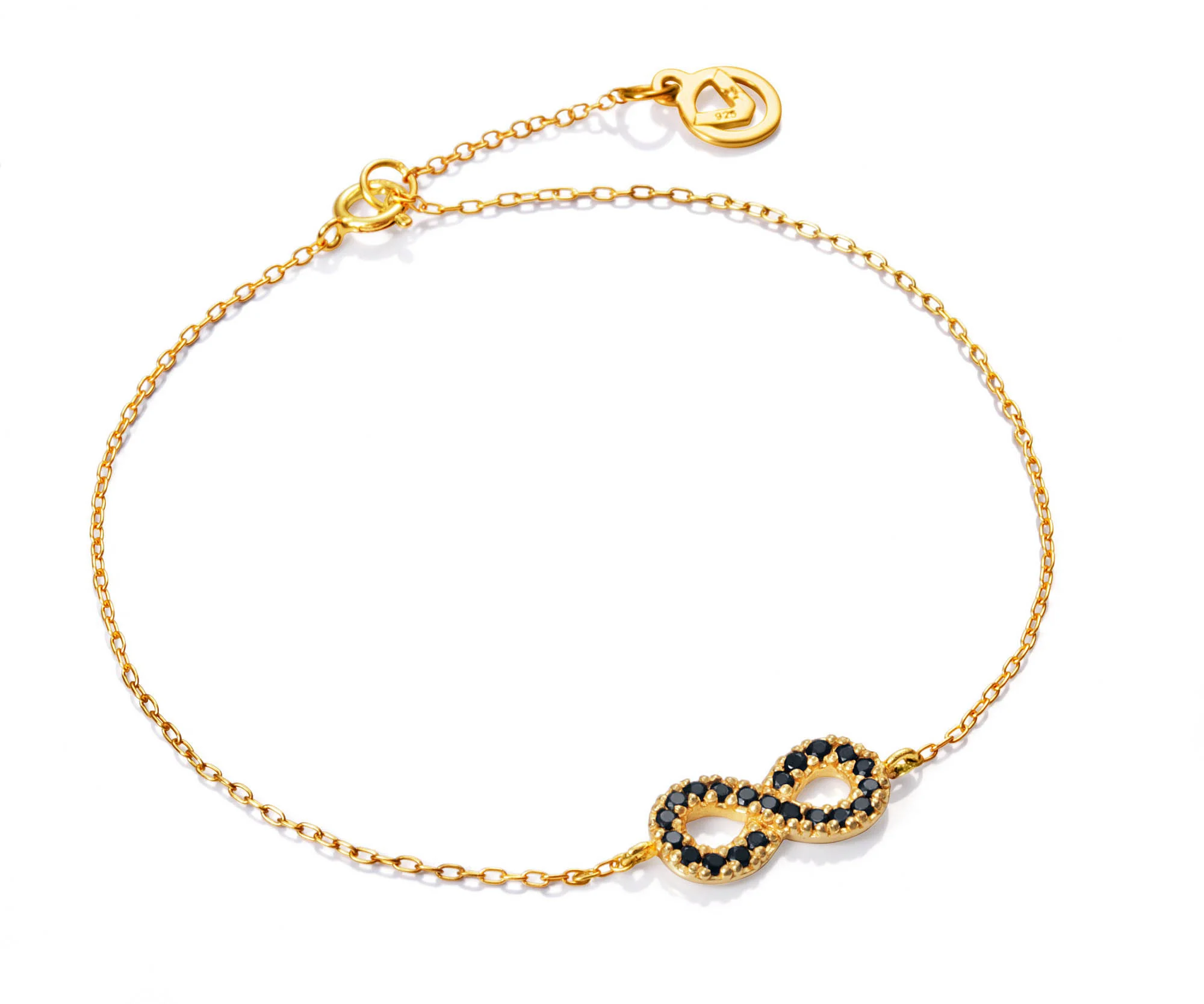 Set deJewels Viceroy. Compuesto por una pulsera y unos pendientes de plata de ley bañados en oro y circonitas negras con motivo infinito, largo de la pulsera 16 cm y 2 cm de extensión.