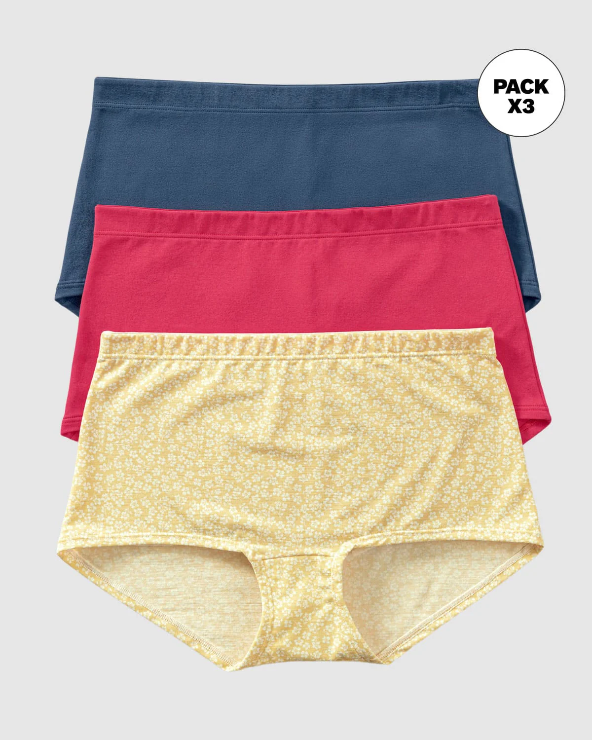 Paquete x 3 bóxers cortos ultracómodos ideales para el uso diario. Es una silueta de tiro medio-alto y cuenta con muy buen cubrimiento en el abdomen y en los glúteos, dándote una sensación de mayor seguridad y que todo está en su lugar. Sin elásticos en piernas y con buena capacidad de ajuste. Su refuerzo interno 100% en algodón te da mayor frescura y suavidad al tacto.