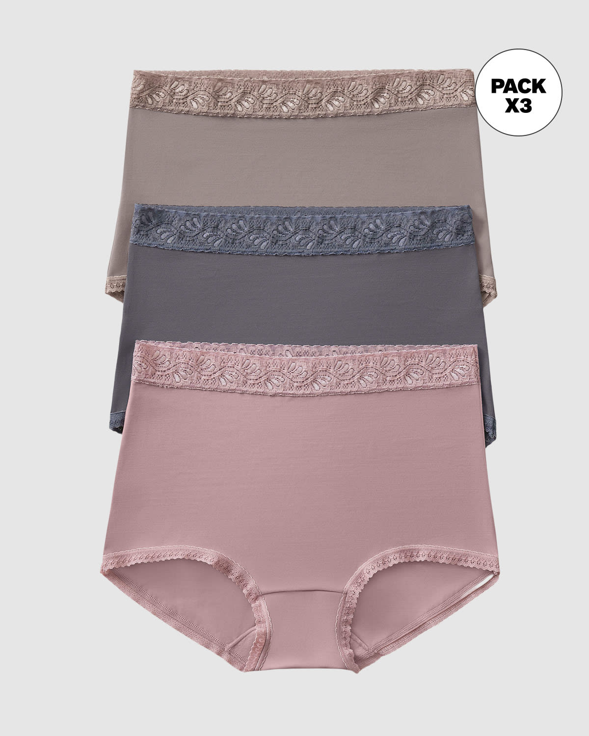 Paquete x 3 calzones clásicos altos en la cintura, con muy buen cubrimiento de abdomen y glúteos. Su diseño combina la comodidad con los detalles femeninos y están elaborados en tela elástica lisa que es suave con la piel. En la cintura cuentan con un elástico ancho en encaje que se adapta a tu cuerpo, los elásticos de las piernas son más delgados y también están elaborados en encaje. Este es un diseño pensado exclusivamente para darte el mayor confort posible.
