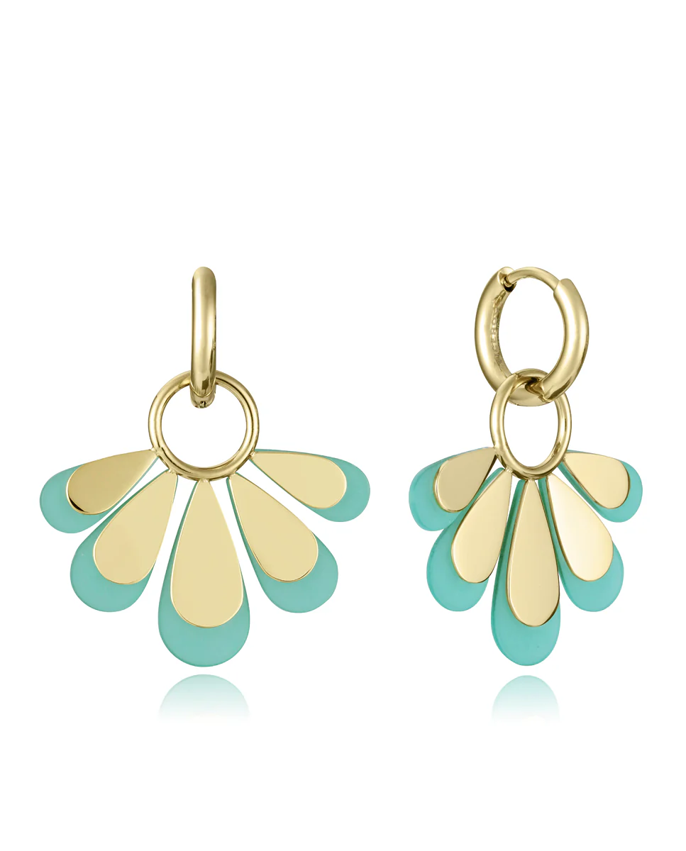 Increíbles pendientes de acero dorado con flor dorada y verde acrílico. Firma el look perfecto con este complemento sin igual, una maravilla que sublimará tu estilo original y personalísimo. Joyas con las que destacar de verdad. Longitud: 3,2 cm.