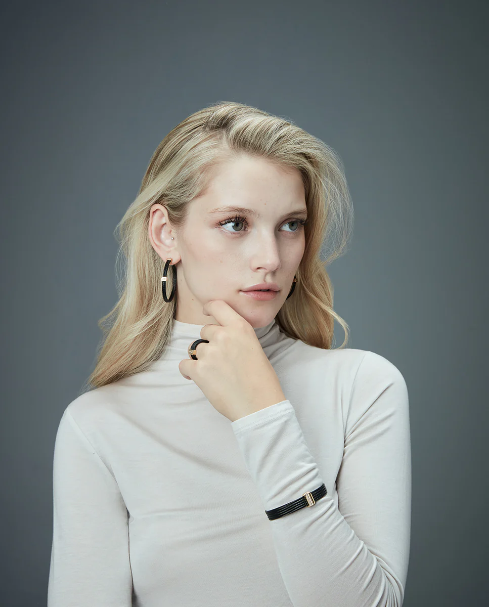 Unos pendientes que fusionan elegancia y modernidad en un diseño audaz. Fabricados en acero con acabados IP negro y dorado, presentan un doble cable unido por una barra central, creando un efecto dinámico y sofisticado. Las circonitas engastadas añaden un toque de brillo luminoso que resalta la pieza con elegancia. Con un diámetro de 4,5 cm, estos pendientes tienen la medida perfecta para destacar con distinción sin perder la ligereza. Ideales para mujeres que buscan un accesorio contemporáneo que combine estilo, versatilidad y un toque de luminosidad. Diámetro 4,5 cm.