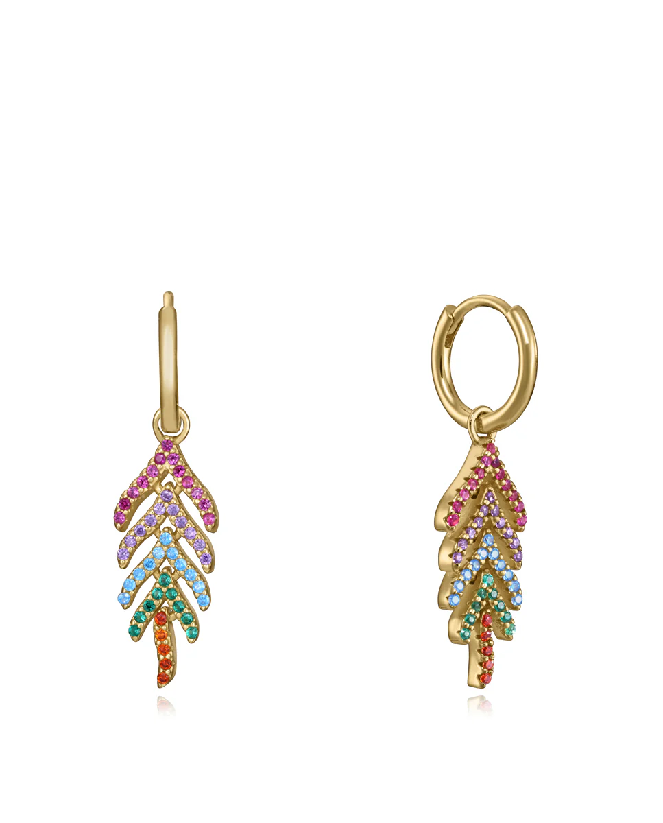 Pendientes dorados de 3,3 cm de largo con circonitas de color naranja, verde, azul, morado y rosa. Una combinación de colores atrevida que alegra cualquier look. Son complementos para gente vital y divertida. Longitud: 3,3 cm.