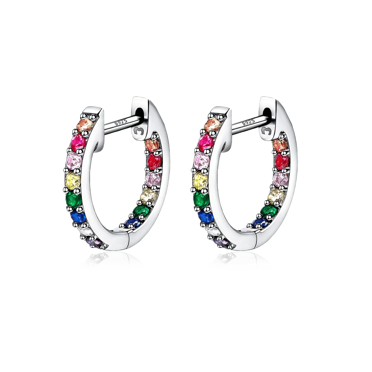 Hermosos pendientes de aros adornados con circonitas de colores, en plata de primera ley (S925).