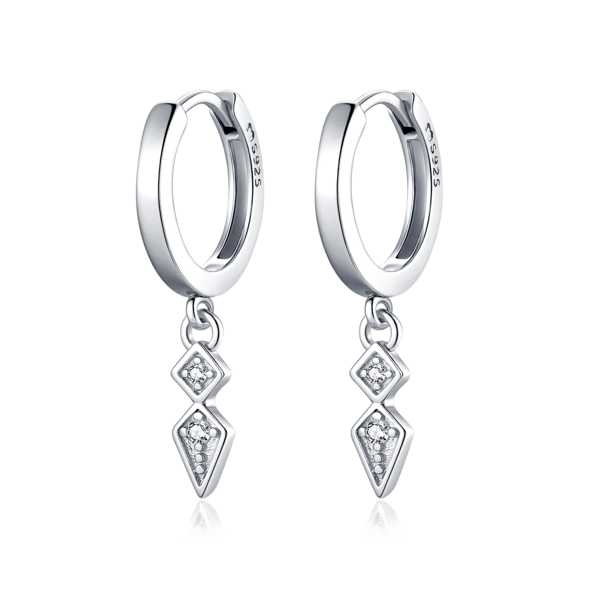 Pendientes de aros con colgante de figuras romboides y circonitas brillantes, en plata de primera ley (S925).