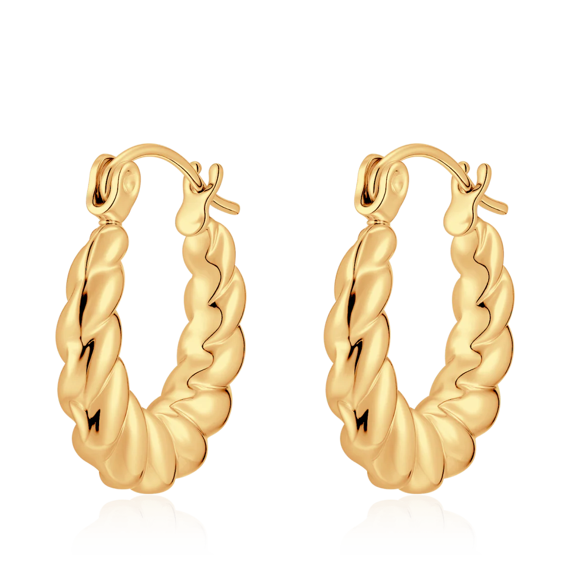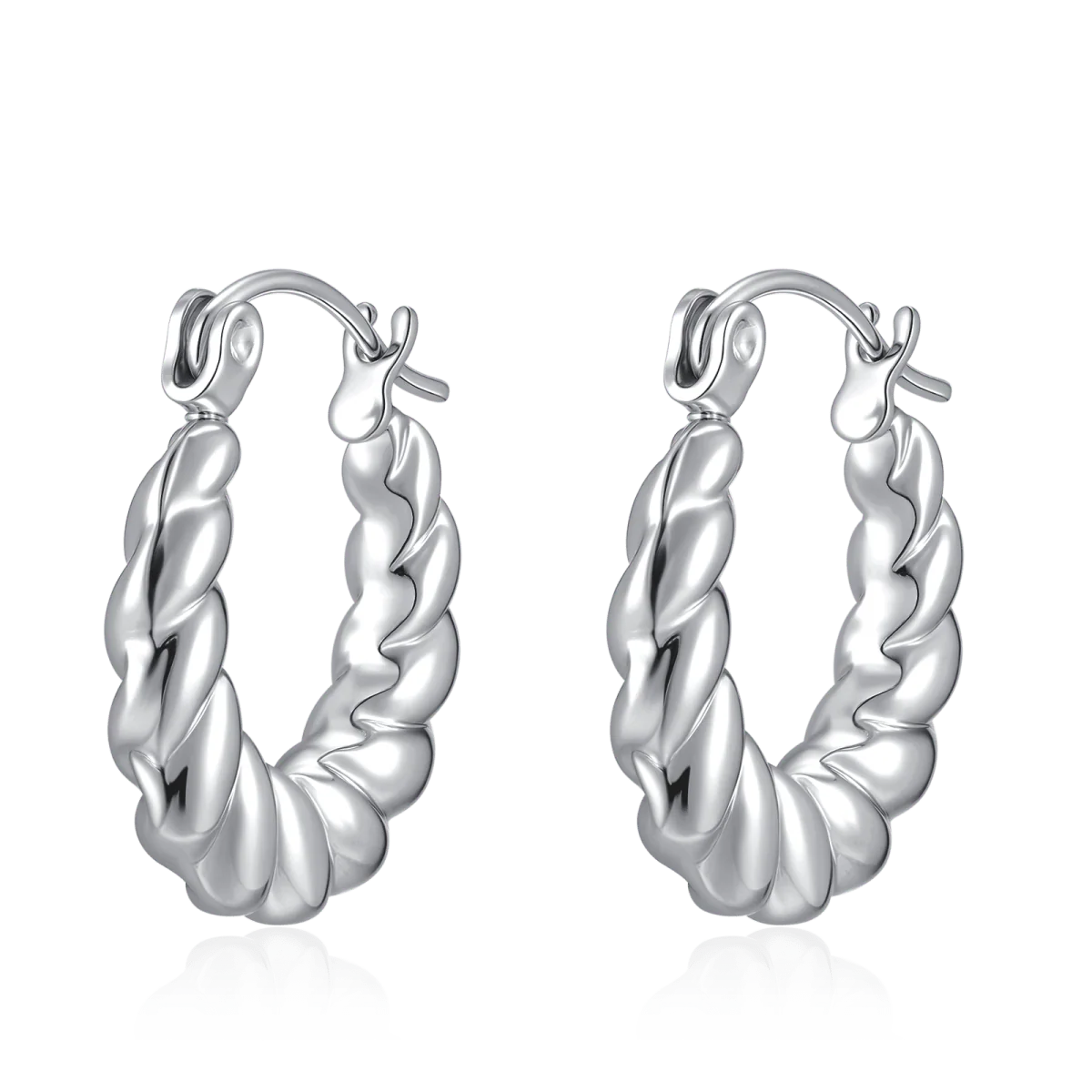 Pendientes de aros resistentes con diseño trenzado y superficie hinchada, que les aporta una textura distintiva, elaborados en acero inoxidable de la mejor calidad (316L).