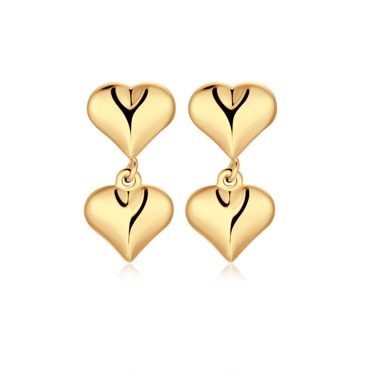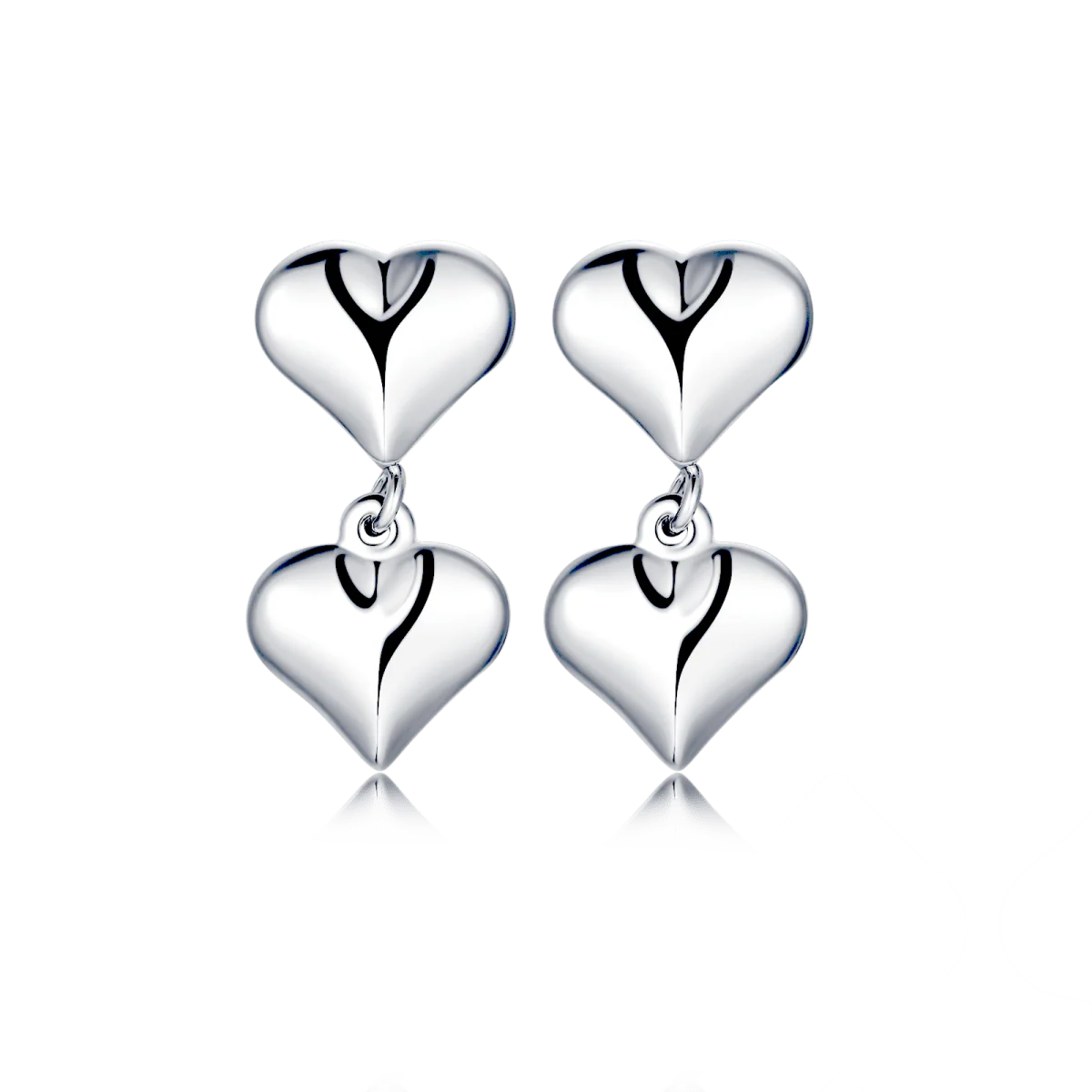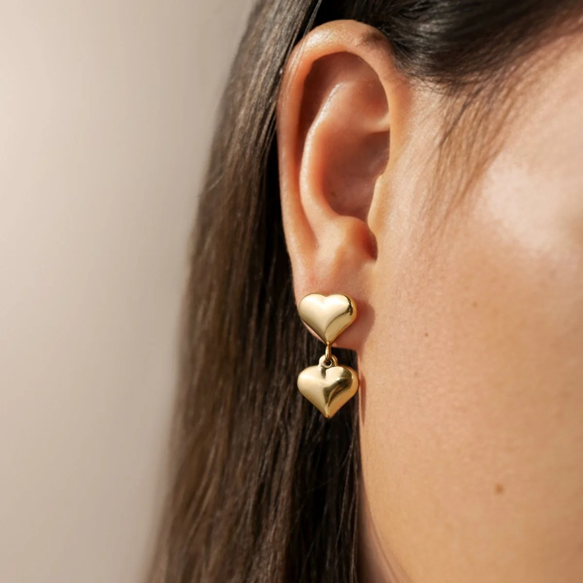 Pendientes con dos corazones de acabado pulido que se encuentran superpuestos verticalmente y conectados por un aro pequeño, también cuentan con una lÃnea decorativa en el centro que añade un detalle sutil a su superficie, elaborados en acero inoxidable de alta calidad (316L).