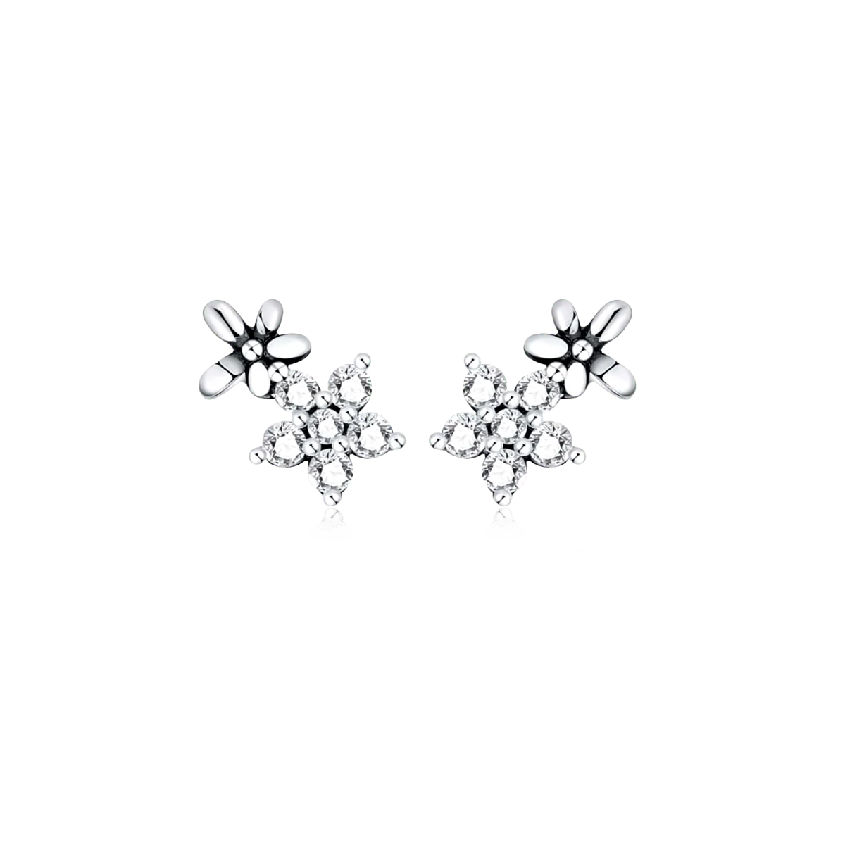 Pendientes de doble diseño floral con textura lisa y circonitas brillantes, en plata de primera ley (S925).