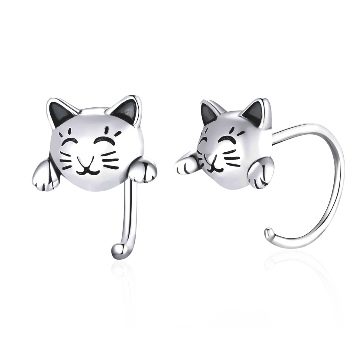 Pendientes en forma de aros adornados con cara de gatito, en plata de primera ley (S925).