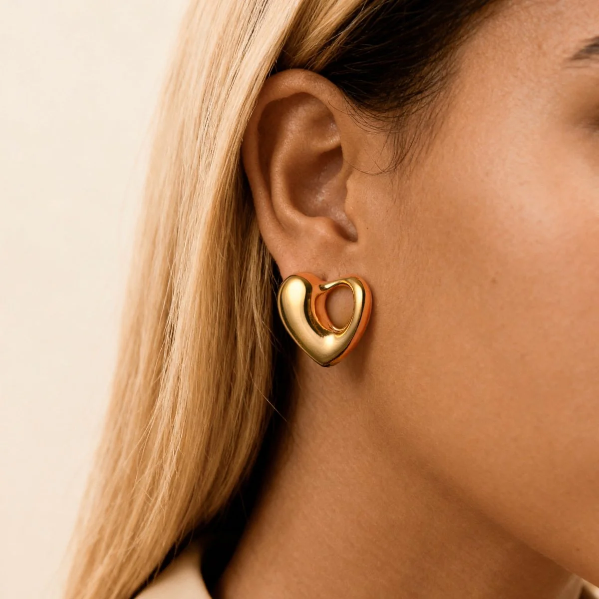 Pendientes de corazones pulidos y perforados en forma abstracta y futurista, que le dan un aspecto distintivo, elaborados en acero inoxidable de la más alta calidad (316L).