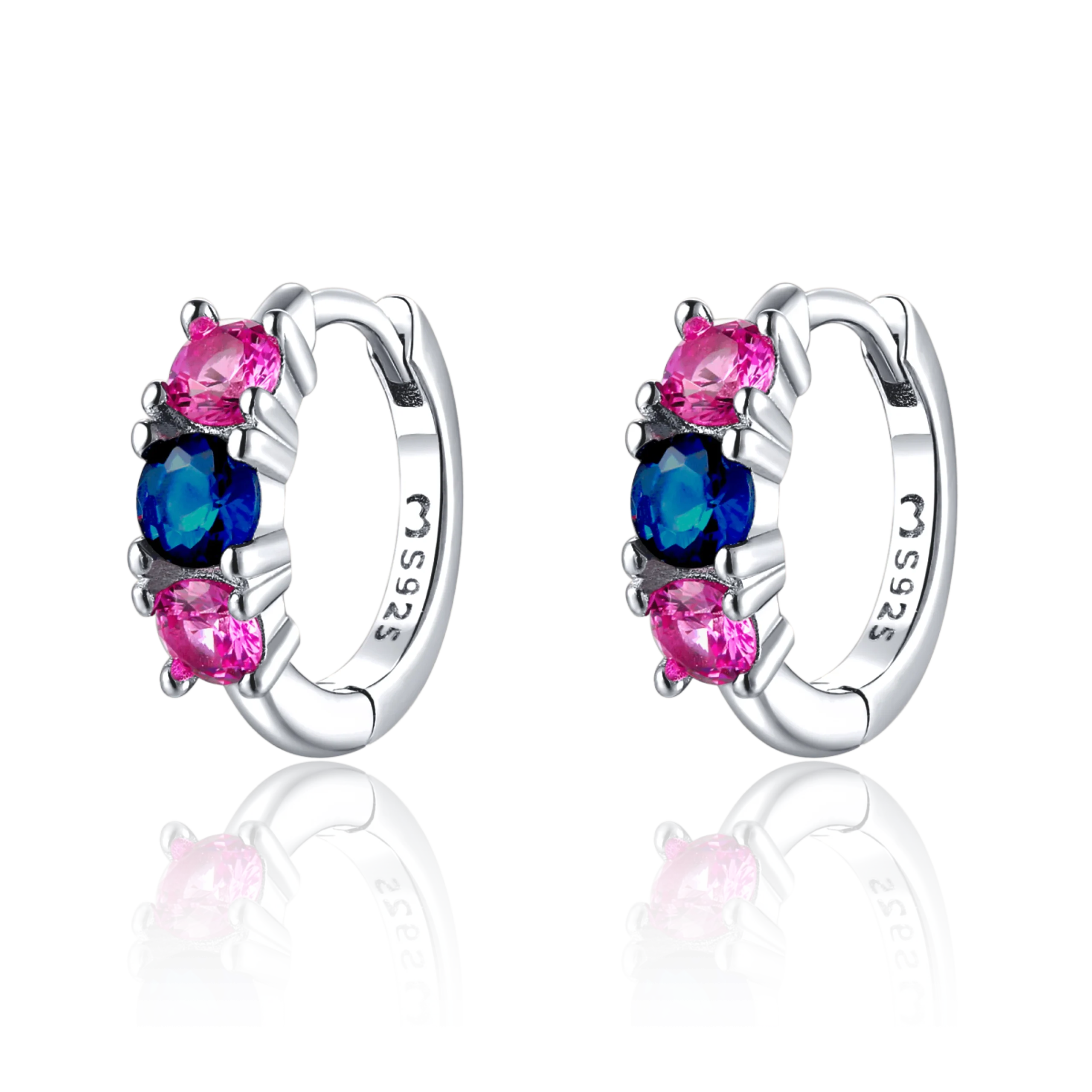 Encantadores pendientes de aros con trÃo de circonitas en color azul y rosa, que representan el amor familiar, en plata de primera ley (S925).