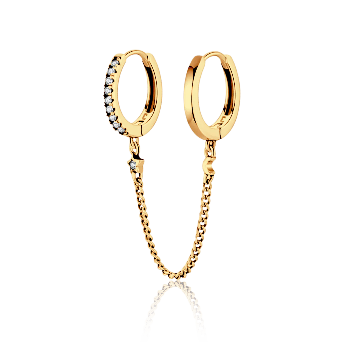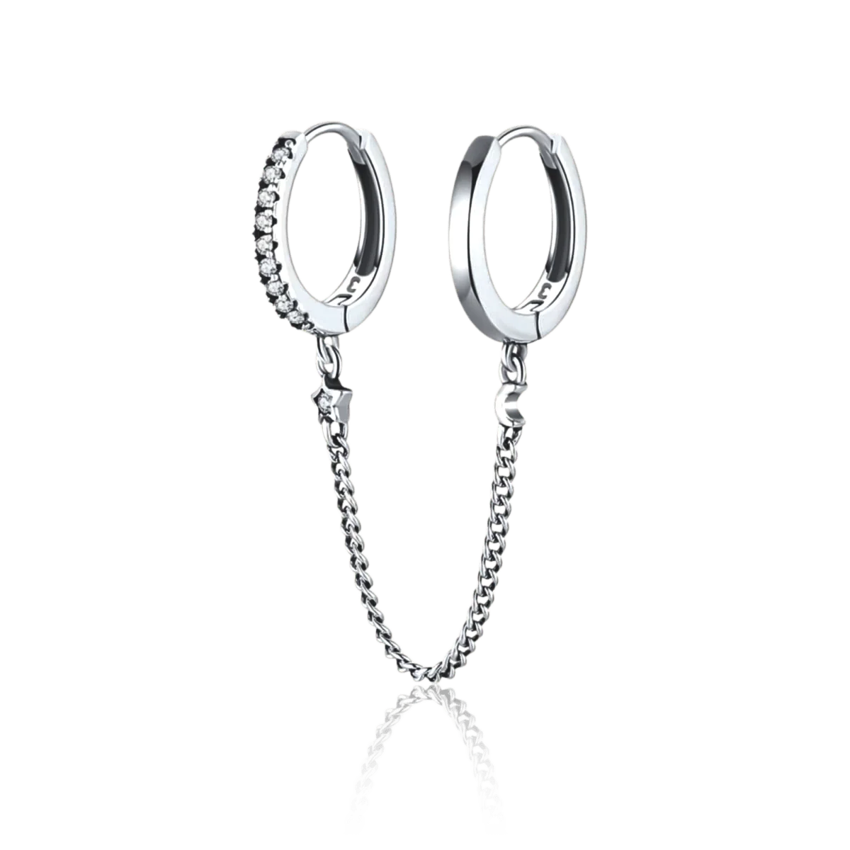 Pendiente individual con diseño de doble aro brillante y liso, unidos por una preciosa cadenita acompañada de una pequeña luna y estrellita, en plata de primera ley (S925).