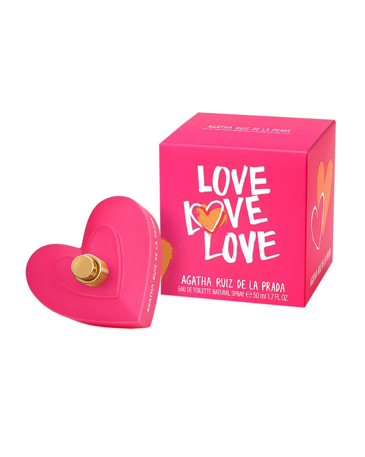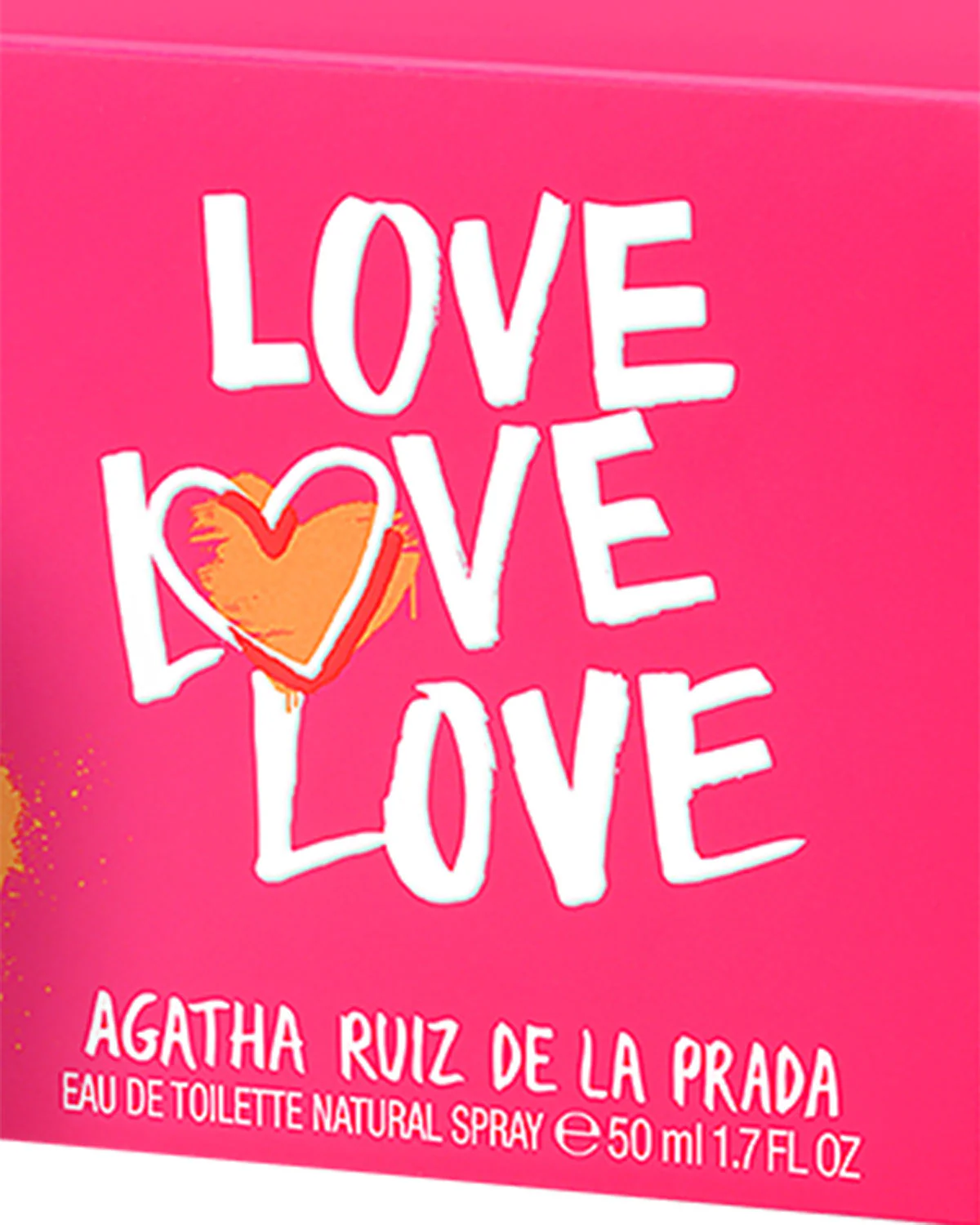 Perfume Agatha Ruiz de la Prada LOVE LOVE LOVE Eau de Toilette. Celebra el amor con su fragancia coqueta, romántica y soñadora. Un perfume para una chica femenina que vive el amor con la máxima intensidad. Contenido: 50 ml.