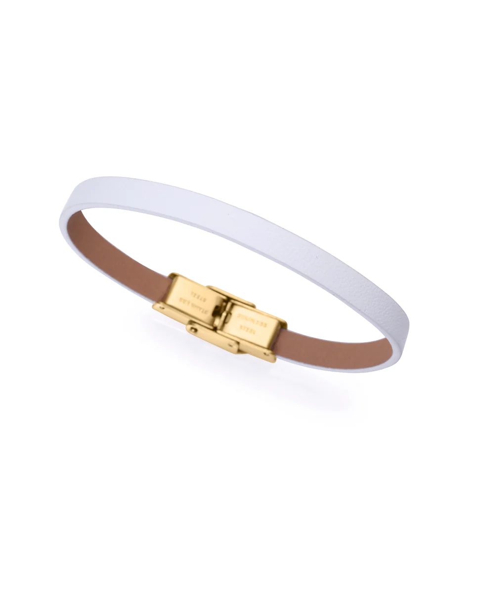 Esta encantadora pulsera de niña en acero IP dorado con detalles en piel blanca es el complemento perfecto para añadir un toque de elegancia y frescura a cualquier ocasión. Su diseño combina la calidez del dorado con la suavidad de la piel, creando una pieza delicada y moderna. Está diseñada para ajustarse cómodamente y destacar por su estilo único. Ideal para regalar o como un detalle especial, esta pulsera es una joya atemporal que refleja buen gusto y sencillez. Largo 18 cm